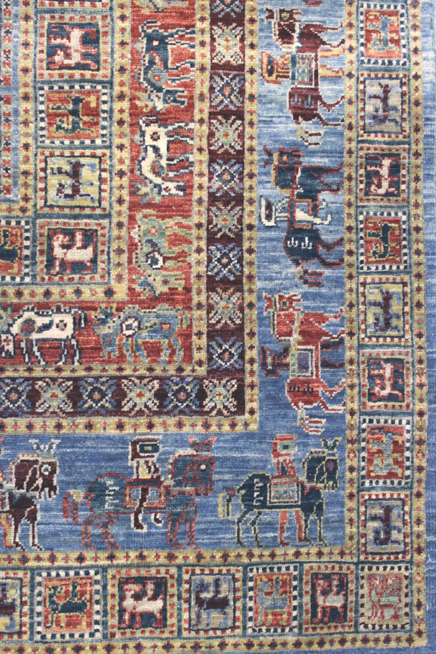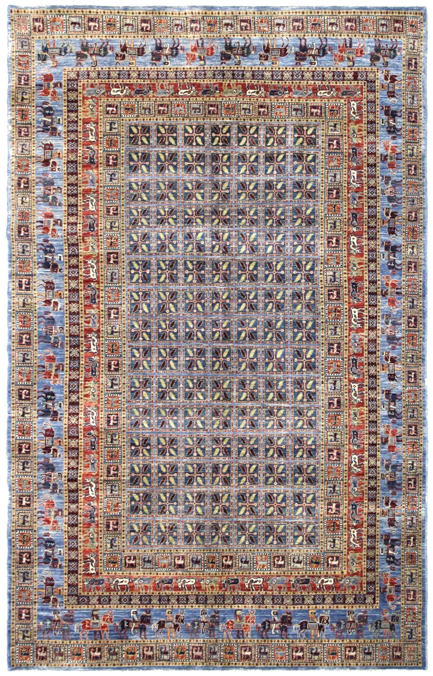 Introducing the exquisite Afghani rug with a splendid Pazyryk design, we proudly present a dazzling tribal masterpiece. This rug's background showcases a captivating shade of teal, beautifully complemented by a brick border. The main color, teal, adds a touch of elegance and sophistication to the overall design. Crafted with the utmost care, this rug features a new condition, ensuring its impeccable quality.