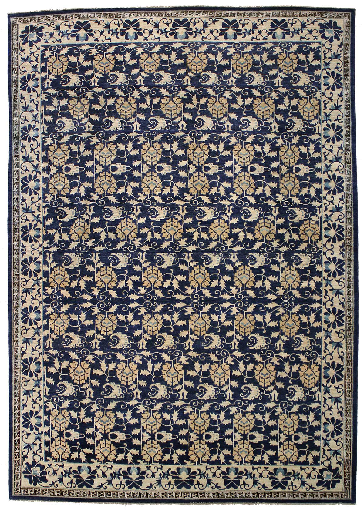 Introducing our exquisite Pakistani rug, featuring the renowned Peking design. This traditional-style rug boasts a navy background and an ivory border, highlighting a mesmerizing blue color scheme. Crafted with utmost precision, this rug is a true masterpiece.