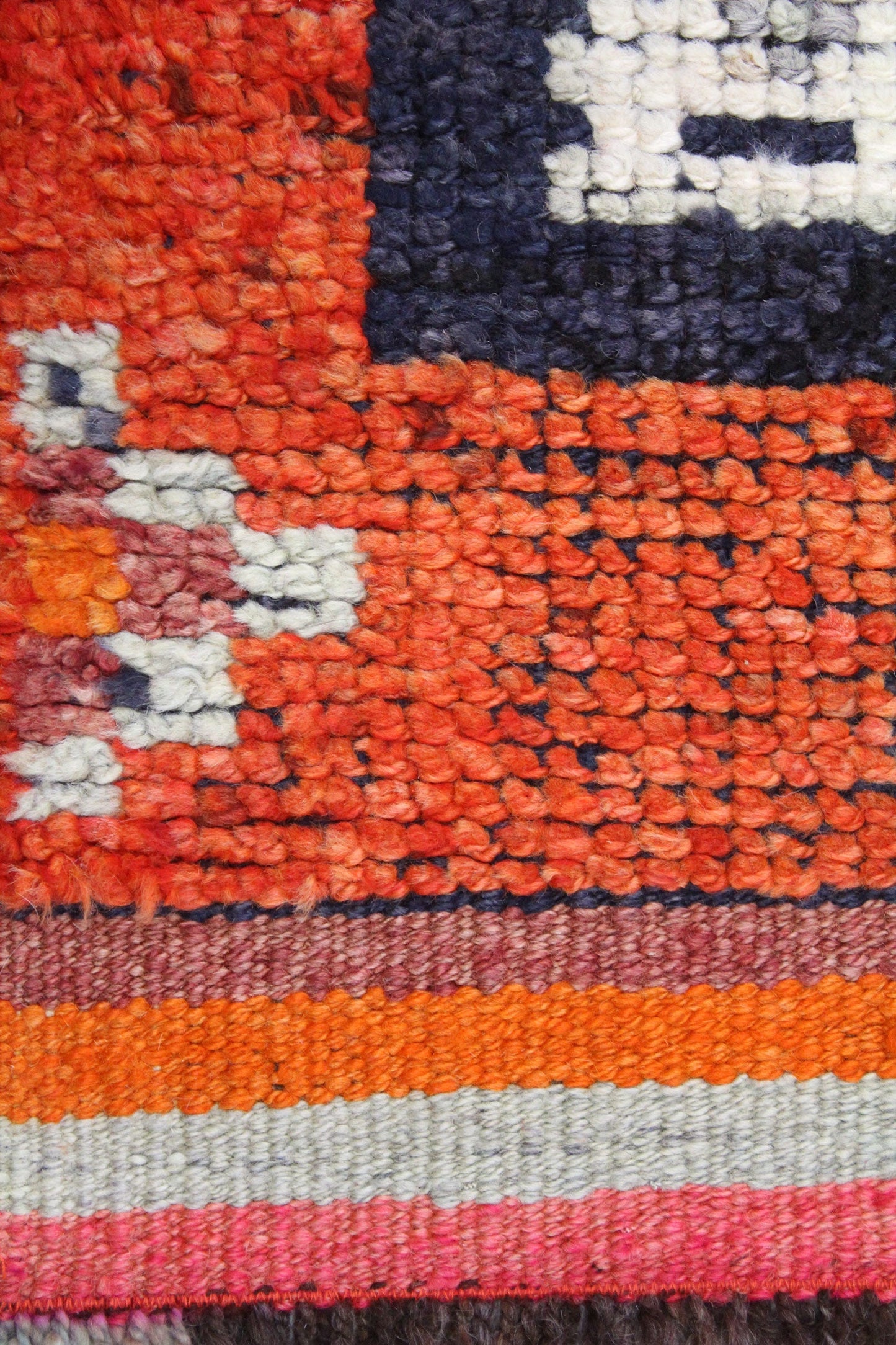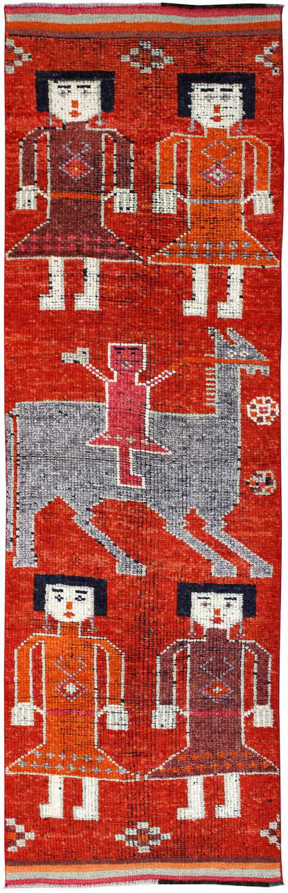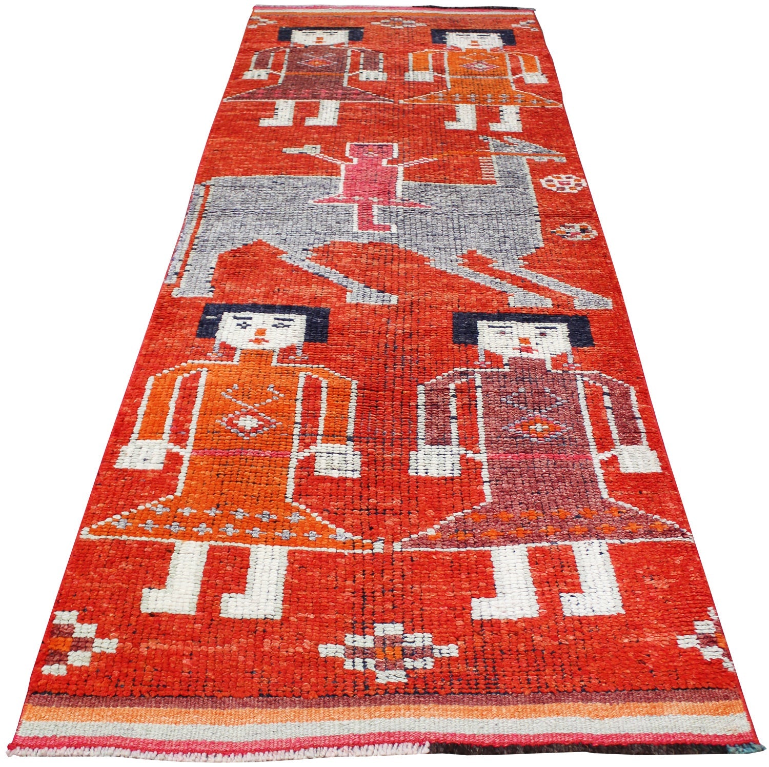 Show off your exquisite taste with our beautiful Vintage Pictorial Herki Handwoven Tribal Rug (J64566). It’s a prime example of a tribal Vintage Turkish Village done right and will add a unique, polished look to your space. Crafted mainly in orange and complemented with tangerine and raspberry, the Pictorial Herki design really pops. The wool pile surface is resilient yet comfortable and the wool foundation provides a sturdy base. This 3' 6" X 11' 0" handwoven rug is of vintage construction (circa 1960) and Turkish origin. All in all, you’re going to love this piece and it’s going to be the perfect addition to your home. Make it happen today — with your own Vintage Pictorial Herki Handwoven Tribal Rug.