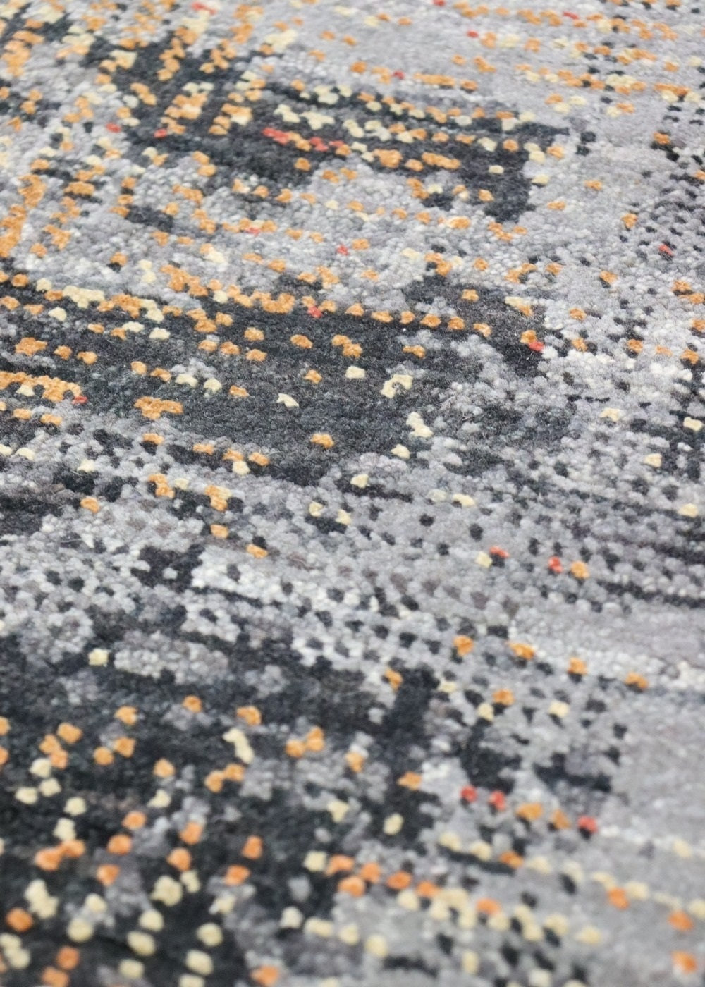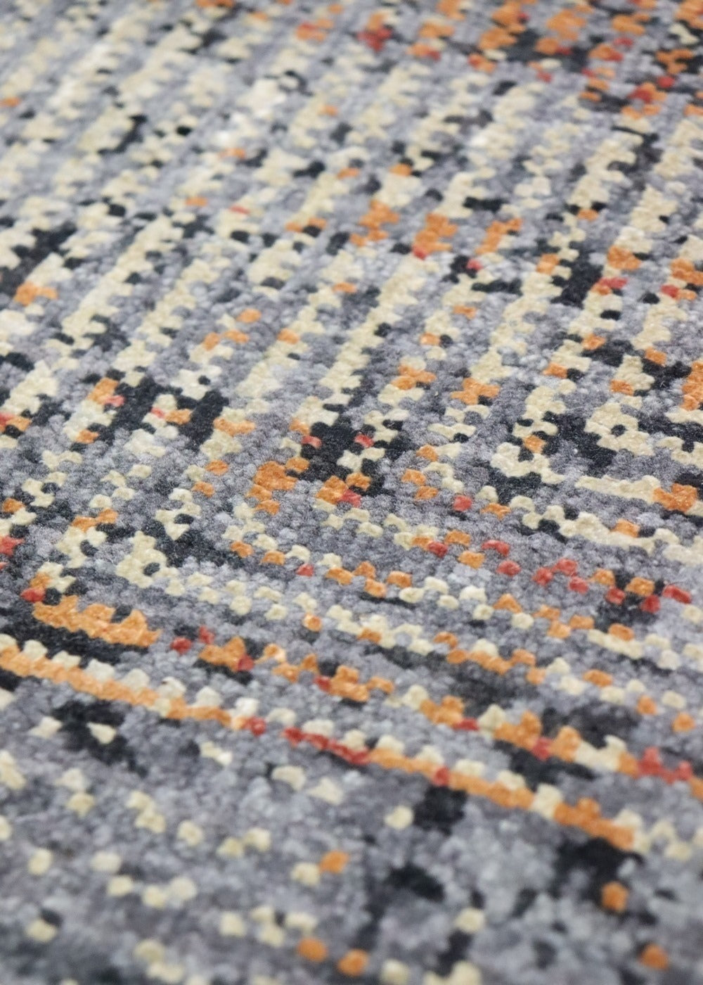 Make your house truly feel like home with our Pixel Grid Handwoven Contemporary Rug (J68021). It's new and contemporary. It’s grey on charcoal with tangerine accent colors. It’s a Modern Abstract style rug with a Pixel Grid motif. All things you gravitate towards when it comes to aesthetics and design in your space. Being a 8' 0" X 9' 10" rug of wool & silk pile on a cotton foundation, you can rest assured that this piece will do more than just make the visual impact and create the vibe you want. It comes from the fine Indian tradition of handwoven rugmaking, meaning this rug will serve you well and look terrific for years. Add that extra special personal touch today with your own Pixel Grid Handwoven Contemporary Rug.