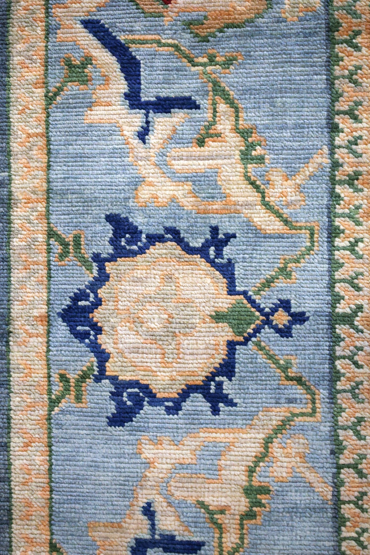 The coloration of these rugs is achieved using chromium (or chrome) dyes, which provide resistance to fading and maintain vibrant hues over time. These high-quality dyes, primarily imported from Switzerland, are applied to the wool in India, combining international expertise with local resources.