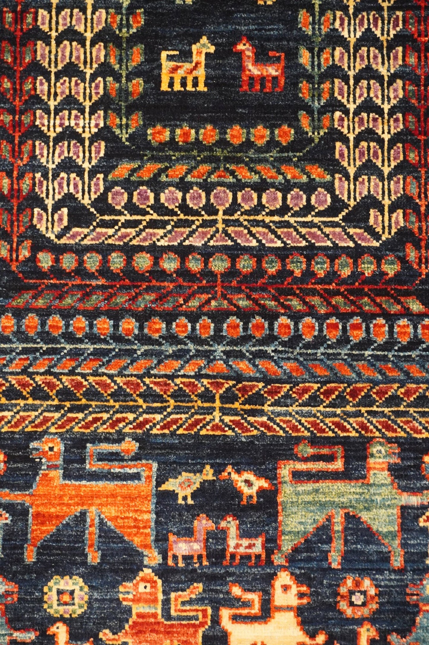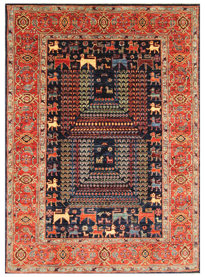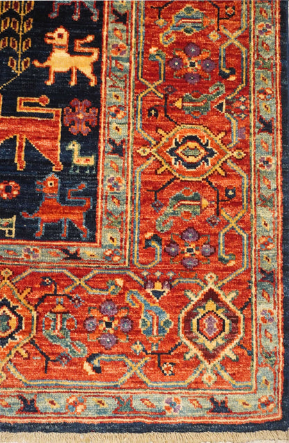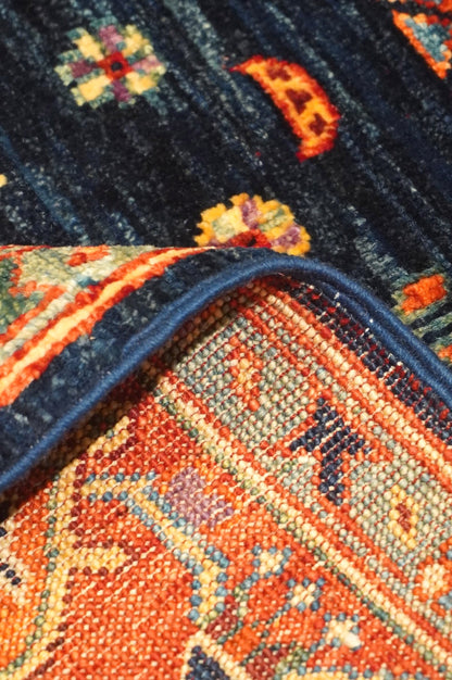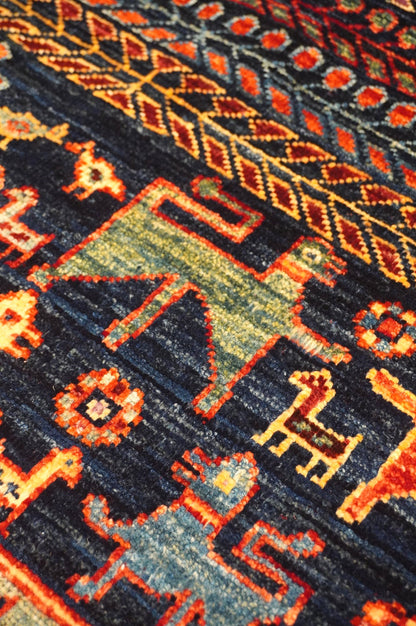 Introducing our exquisite Afghani rug, featuring the captivating Qashqai design. This tribal-style rug showcases a rich navy background, elegantly framed by a striking rust border. Crafted with meticulous care, this rug is made using high-quality wool on a cotton base, ensuring enduring beauty and comfort.