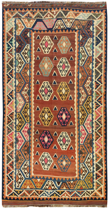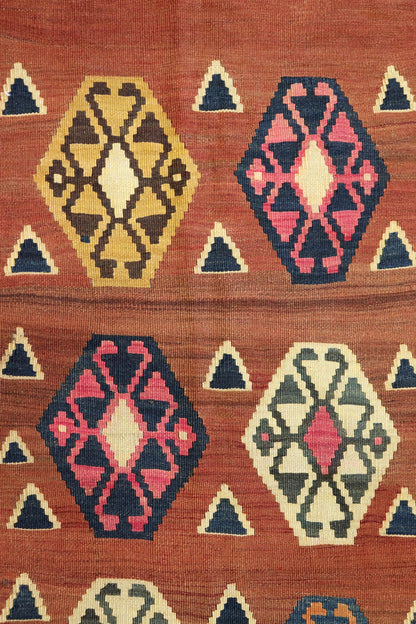 Show off your exquisite taste with our beautiful Vintage Qashqai Kilim Handwoven Tribal Rug (J65245). It’s a prime example of a tribal Kilim done right and will add a unique, polished look to your space. Crafted mainly in brown and complemented with walnut and blue, the Qashqai Kilim design really pops. The wool flatweave surface is resilient yet comfortable and the wool foundation provides a sturdy base. This 4' 10" X 9' 1" handwoven rug is of vintage construction and Persian origin. All in all, you’re going to love this piece and it’s going to be the perfect addition to your home. Make it happen today — with your own Vintage Qashqai Kilim Handwoven Tribal Rug.