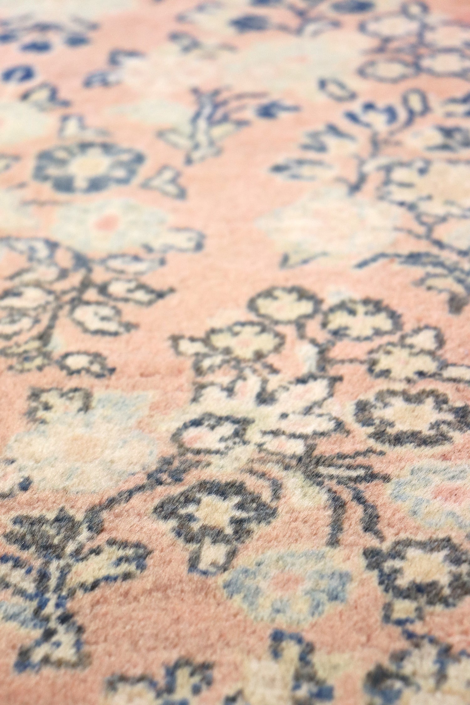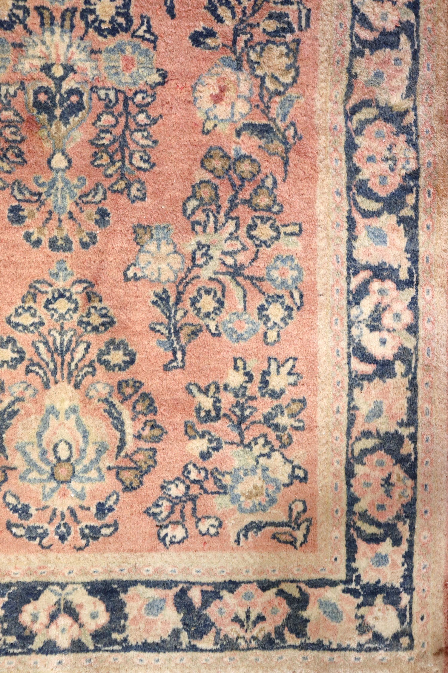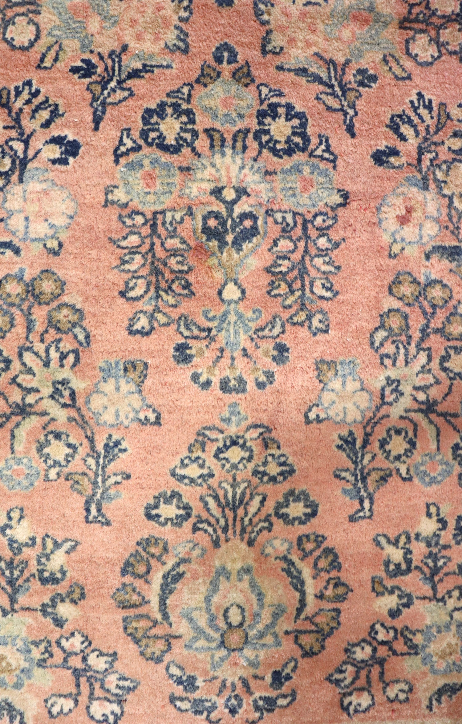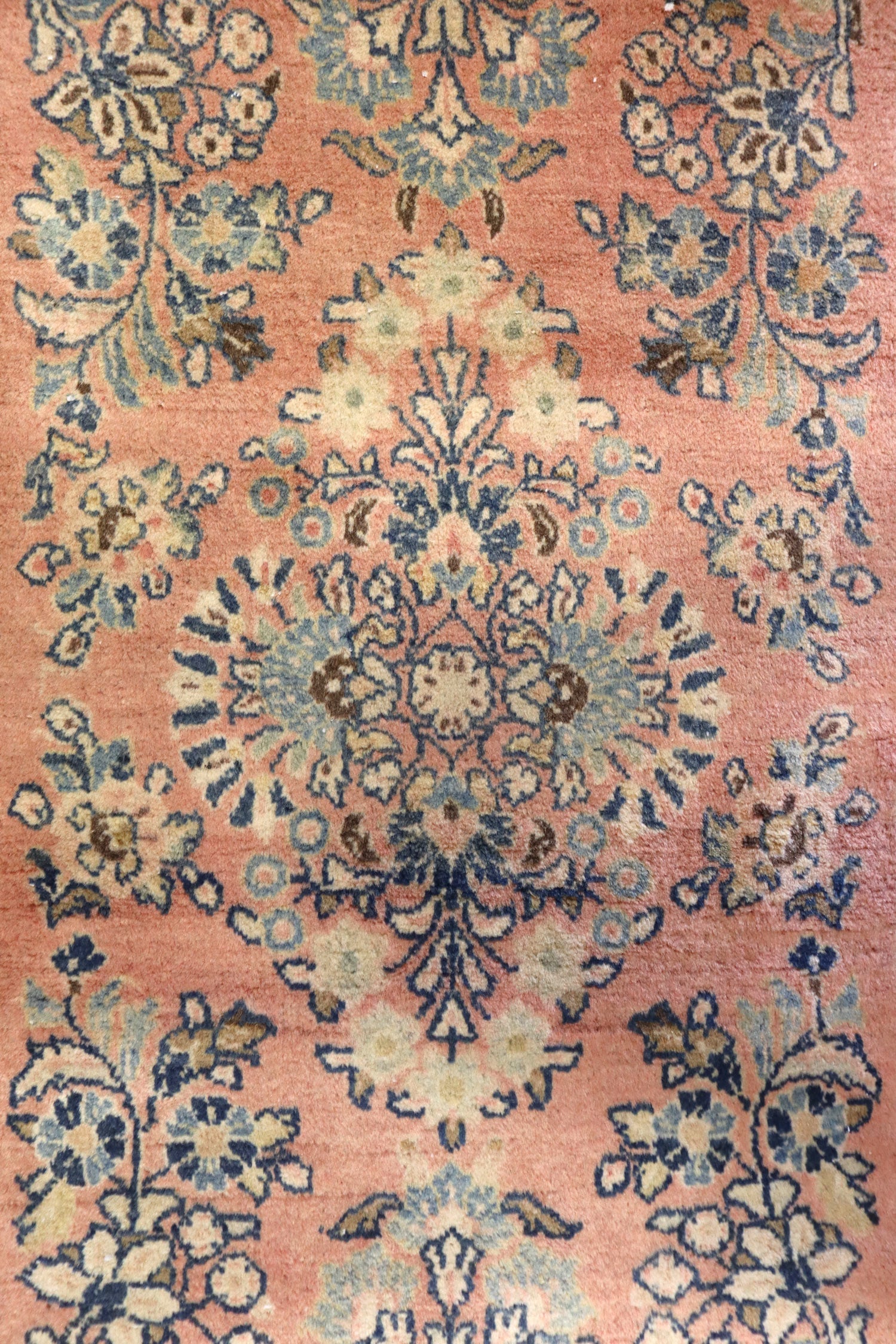 The field of the rug is primarily rose-colored, interspersed with intricate floral and foliate motifs, which are a hallmark of Sarouk designs. The central medallion and the surrounding patterns are symmetrically arranged, displaying a balance that is typical of Persian handcrafted rugs. The motifs are rendered in shades of blue, green, cream, and hints of pink, creating a rich contrast against the rose background.