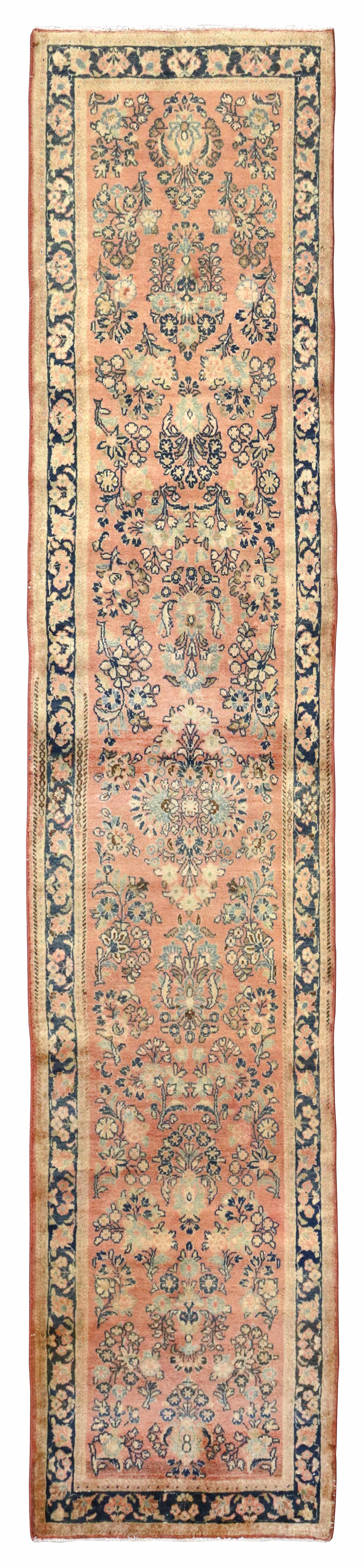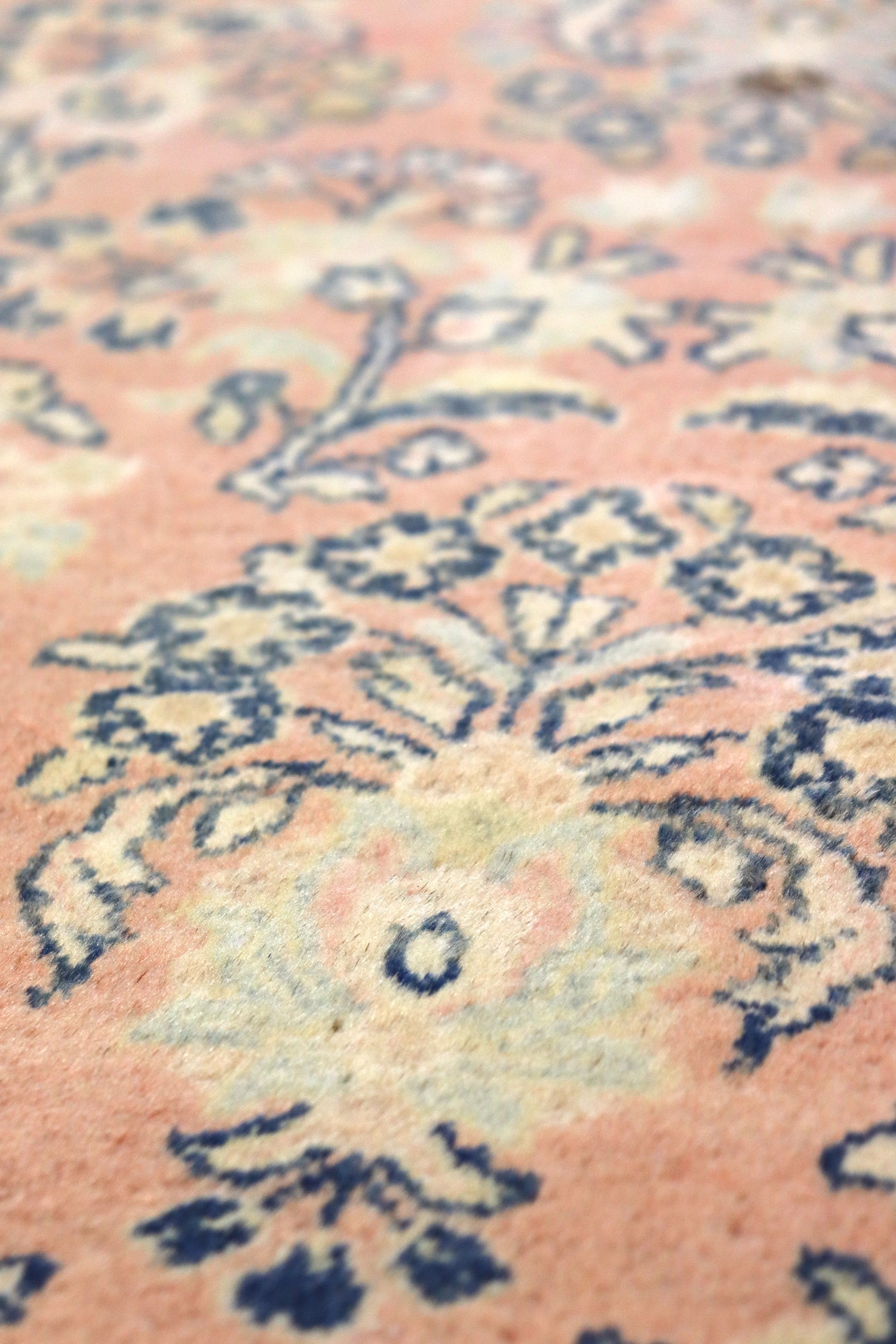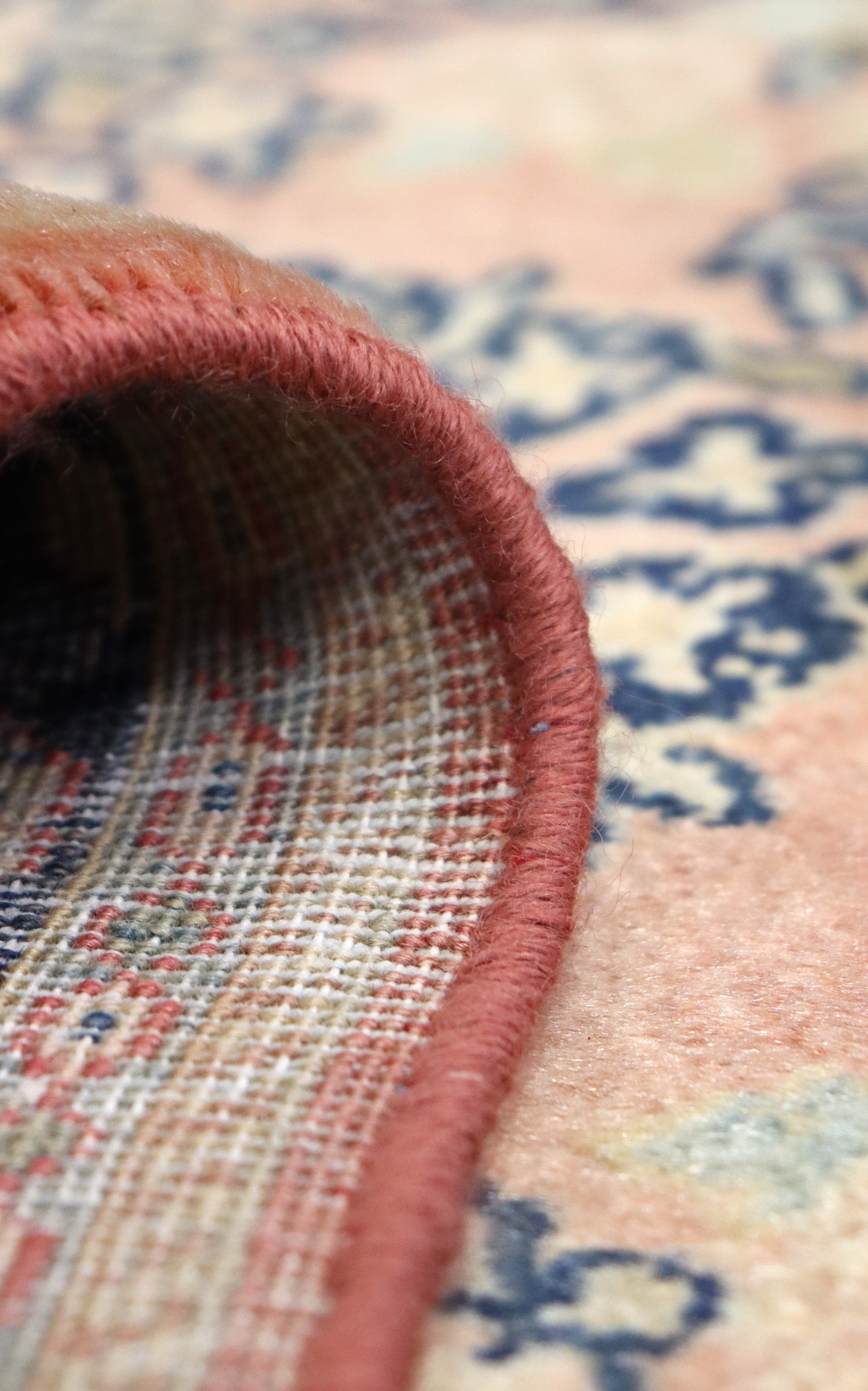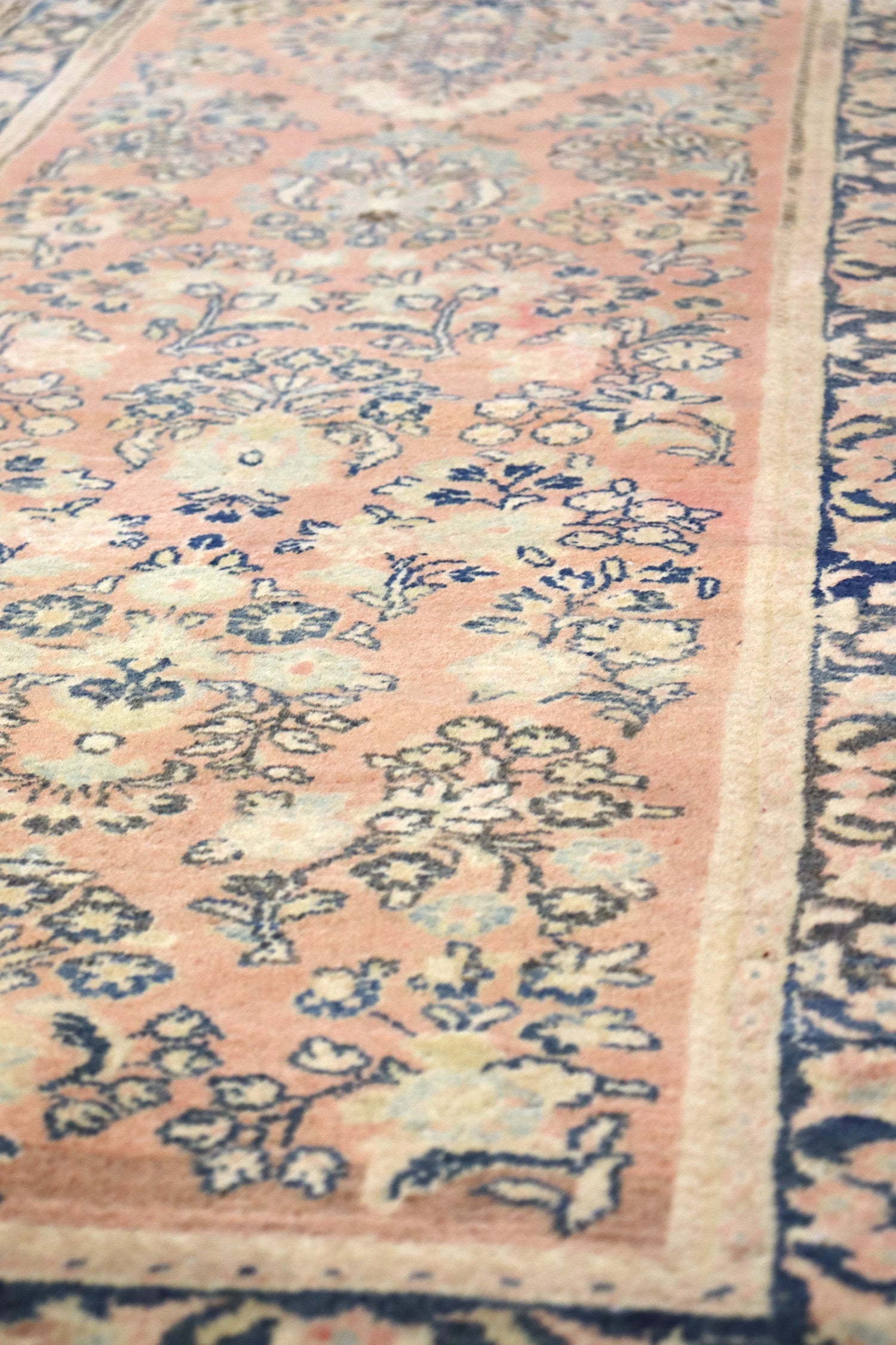 The field of the rug is primarily rose-colored, interspersed with intricate floral and foliate motifs, which are a hallmark of Sarouk designs. The central medallion and the surrounding patterns are symmetrically arranged, displaying a balance that is typical of Persian handcrafted rugs. The motifs are rendered in shades of blue, green, cream, and hints of pink, creating a rich contrast against the rose background.