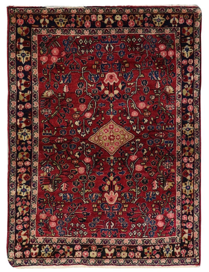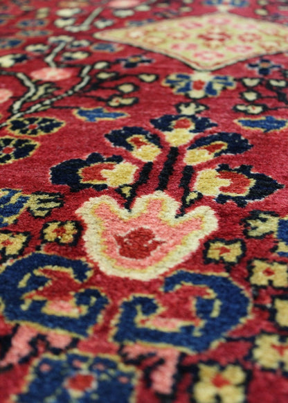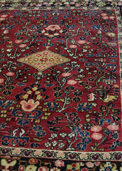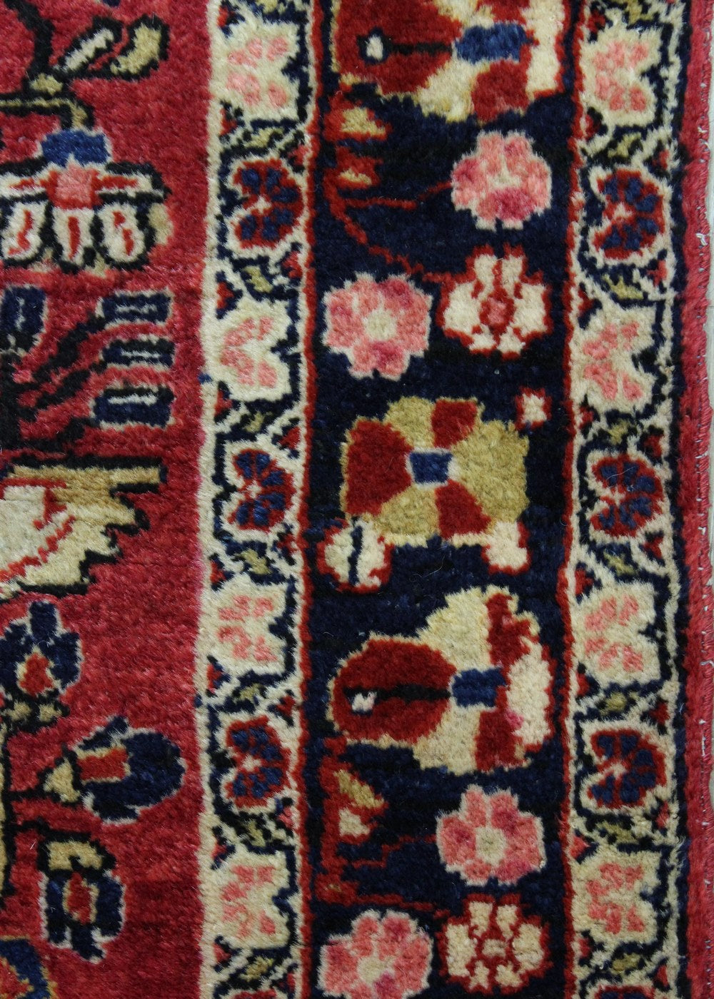 The antique rug described here is a Persian Sarouk, originating from circa 1920. This rug is a fine example of traditional Persian artistry, featuring a rich wine background and a prominent navy border, with red as the main color. Crafted with a wool pile on a cotton foundation, this rug exemplifies the high-quality materials and craftsmanship often associated with Sarouk rugs of this era.
