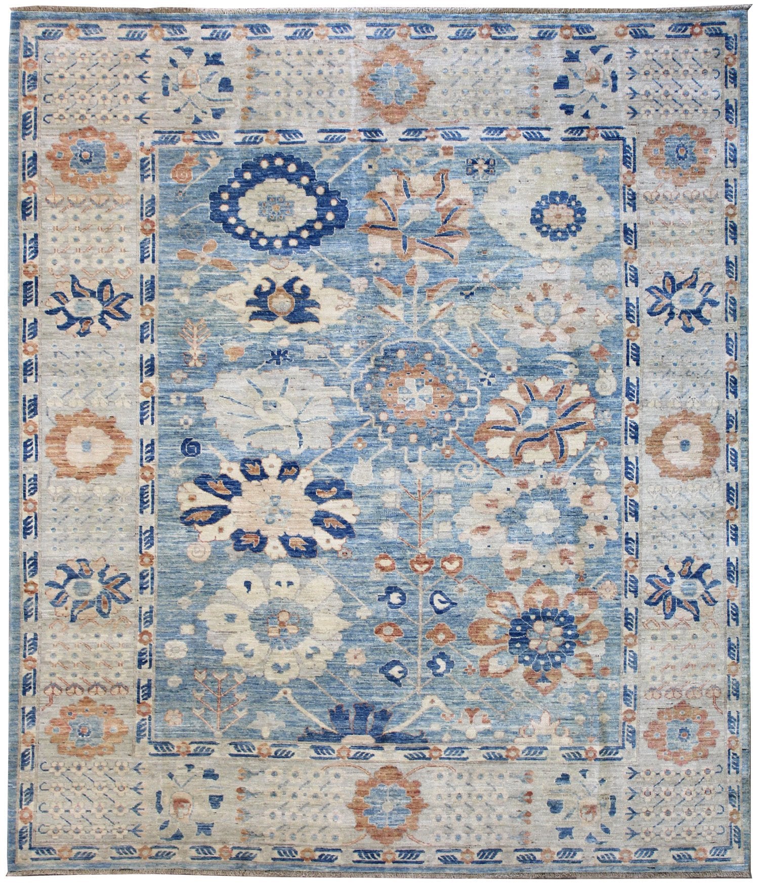 The size of this rug measures 8'1" x 9'9", making it a versatile and impactful addition to any room. Crafted using wool on a cotton foundation, this rug achieves the perfect balance of comfort and durability. Its double wefted, heavily packed depressed warp weaving technique ensures unmatched durability, making it one of the most resilient handwoven carpets available today.