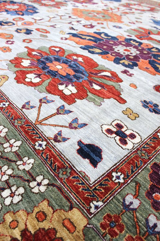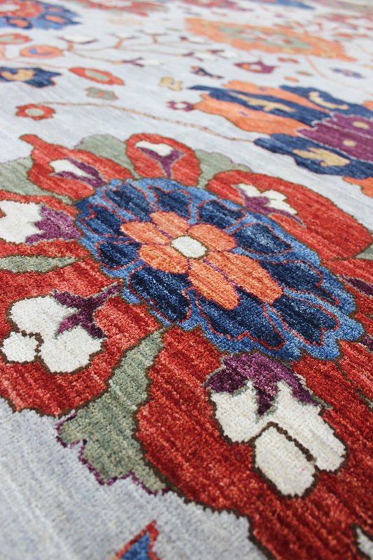 The raw Ghazni wool is then transported to the western side of Afghanistan, near Herat, where it undergoes the meticulous process of hand carding and spinning into carpet yarn. The weaving itself takes place on traditional floor looms in the weavers' own homes, reflecting a cottage industry type production.
