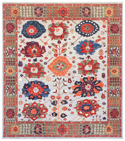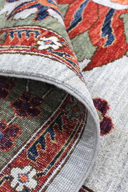 Introducing our exquisite Afghani rug, featuring the intricate Sauj Balugh design, which is a stunning representation of tribal artistry. The rug showcases a sophisticated grey background, complemented by a moss-colored border, adding an element of visual appeal.