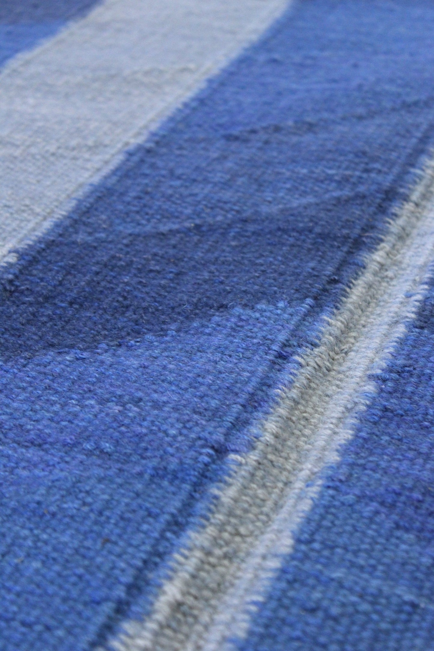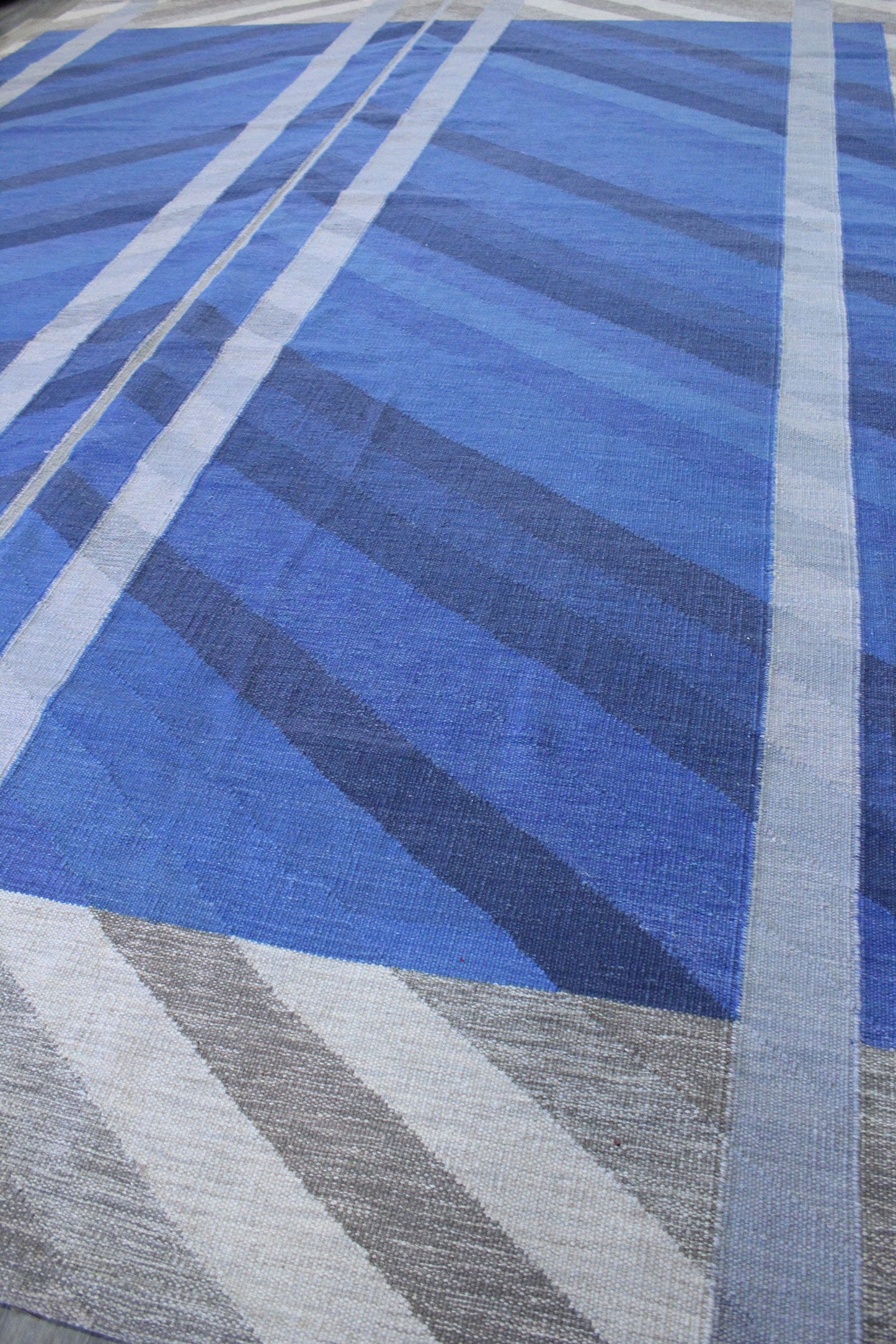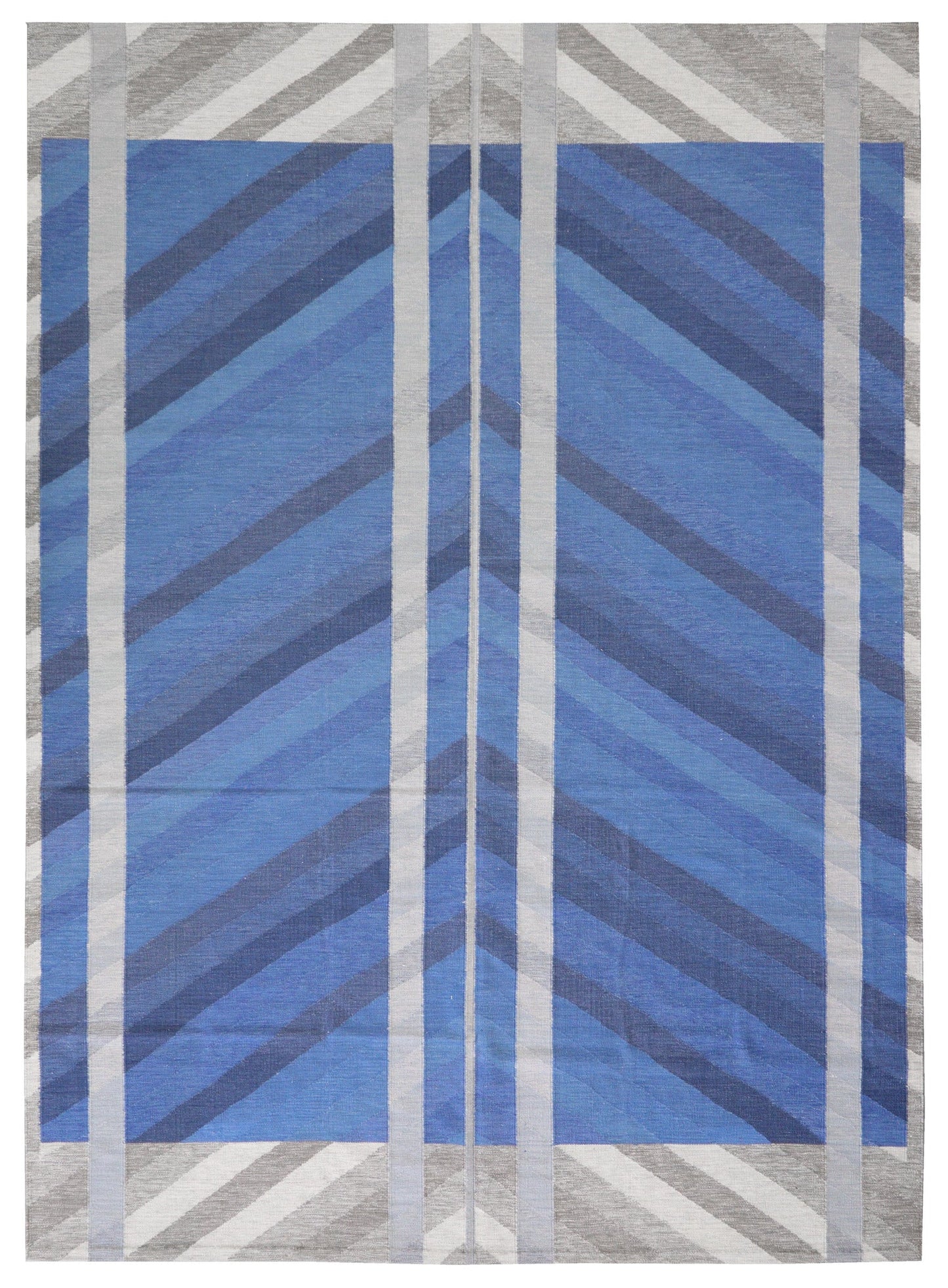Make your house truly feel like home with our Scandinavian Handwoven Contemporary Rug (J68978). It's new and contemporary. It’s blue on medium blue with ivory accent colors. It’s a Modern Flatweave style rug with a Scandinavian motif. All things you gravitate towards when it comes to aesthetics and design in your space. Being a 12' 6" X 17' 3" rug of wool flatweave on a cotton foundation, you can rest assured that this piece will do more than just make the visual impact and create the vibe you want. It comes from the fine Indian tradition of handwoven rugmaking, meaning this rug will serve you well and look terrific for years. Add that extra special personal touch today with your own Scandinavian Handwoven Contemporary Rug.