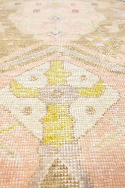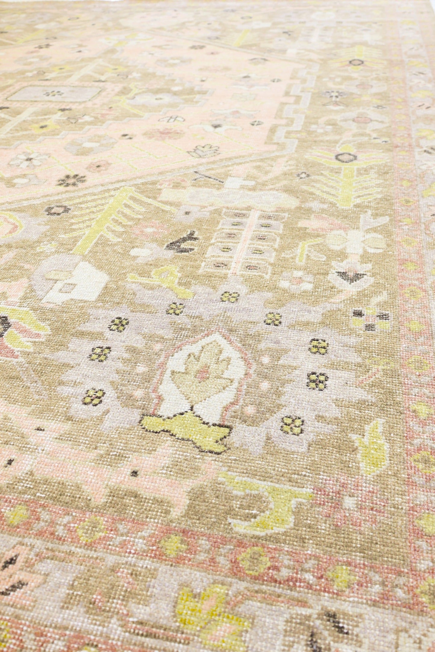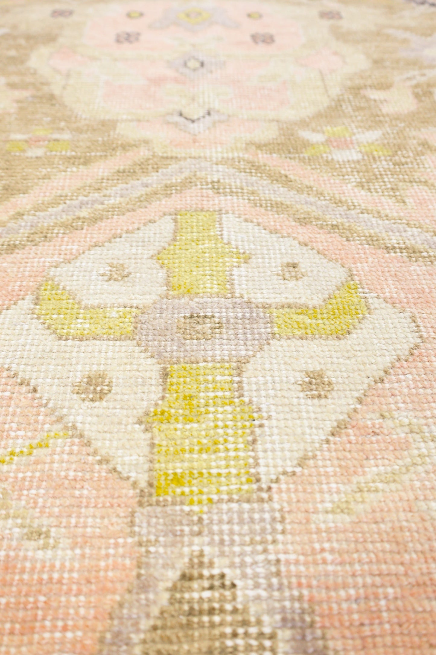 The central medallion, a hallmark of oriental rugs, is a geometric and floral mix featuring blush pink, beige, and faded gold hues. The design is highly symmetrical both vertically and horizontally. The pattern density varies, with more intricate and closely packed motifs in the central region and more dispersed patterns towards the edges.