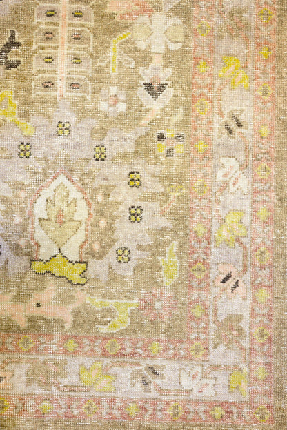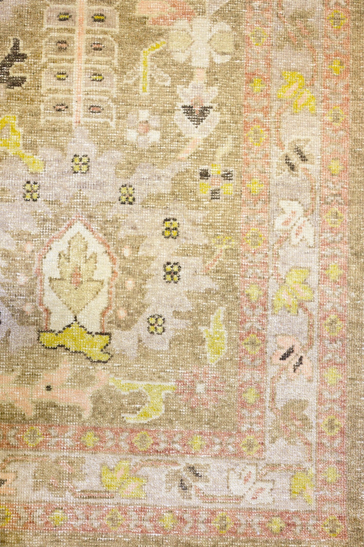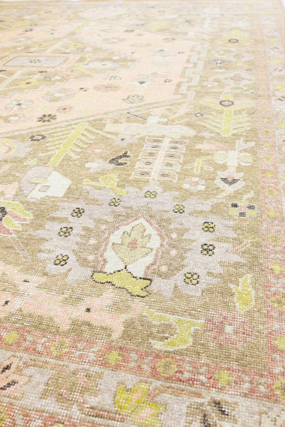 Originating from India, this rug is an example of a Serapi design with a transitional style. The main background color is a delicate peach, complemented by a chartreuse border and beige as the primary color. Constructed with wool on a cotton foundation, it showcases intricate craftsmanship.