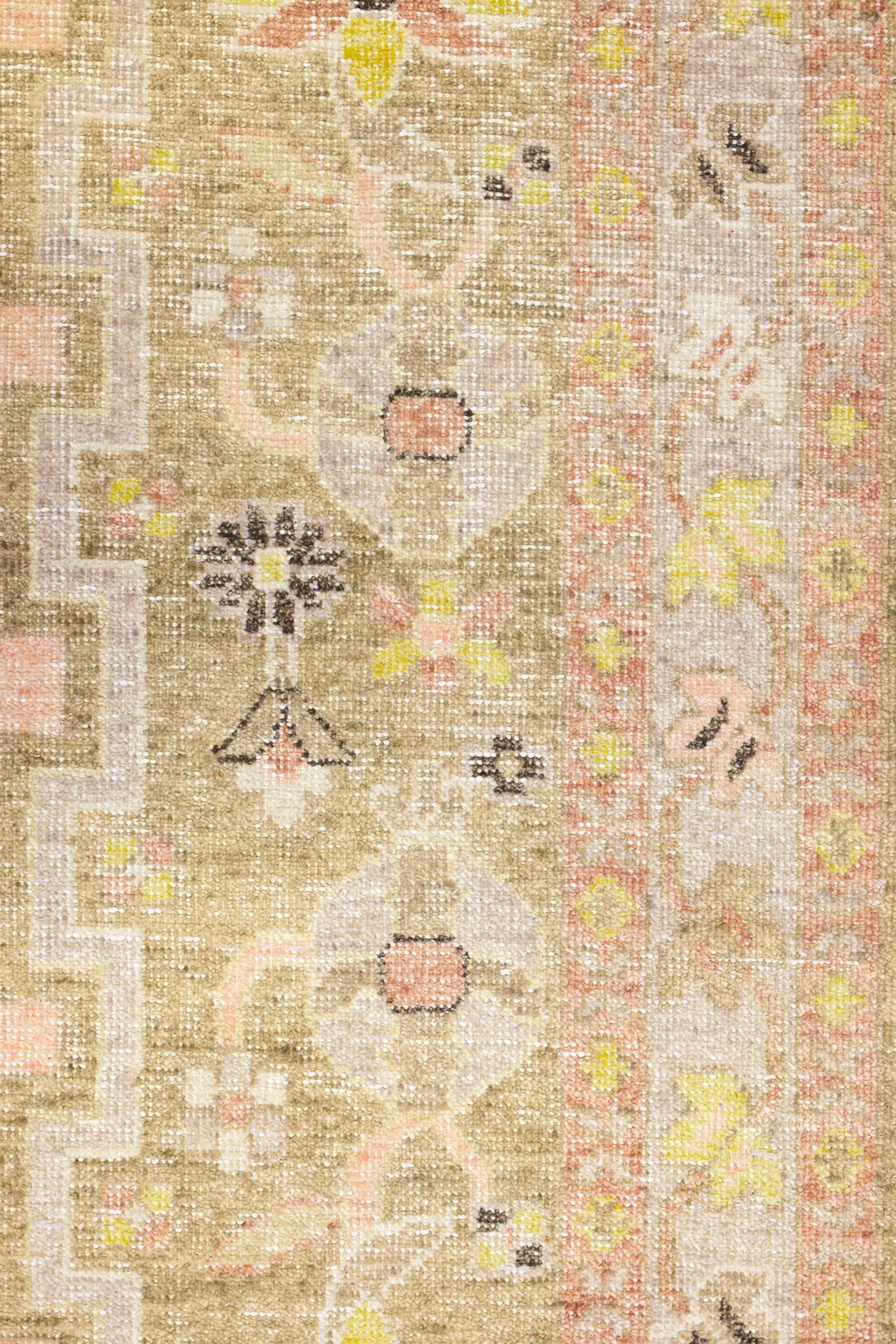 Designs draw inspiration from antique Persian and Khotanese carpets, featuring a mix of traditional and modern colorations. This rug has a knots-per-square-inch (KPSI) of 104, amounting to a total of 1,635,105 individually hand-tied knots.
