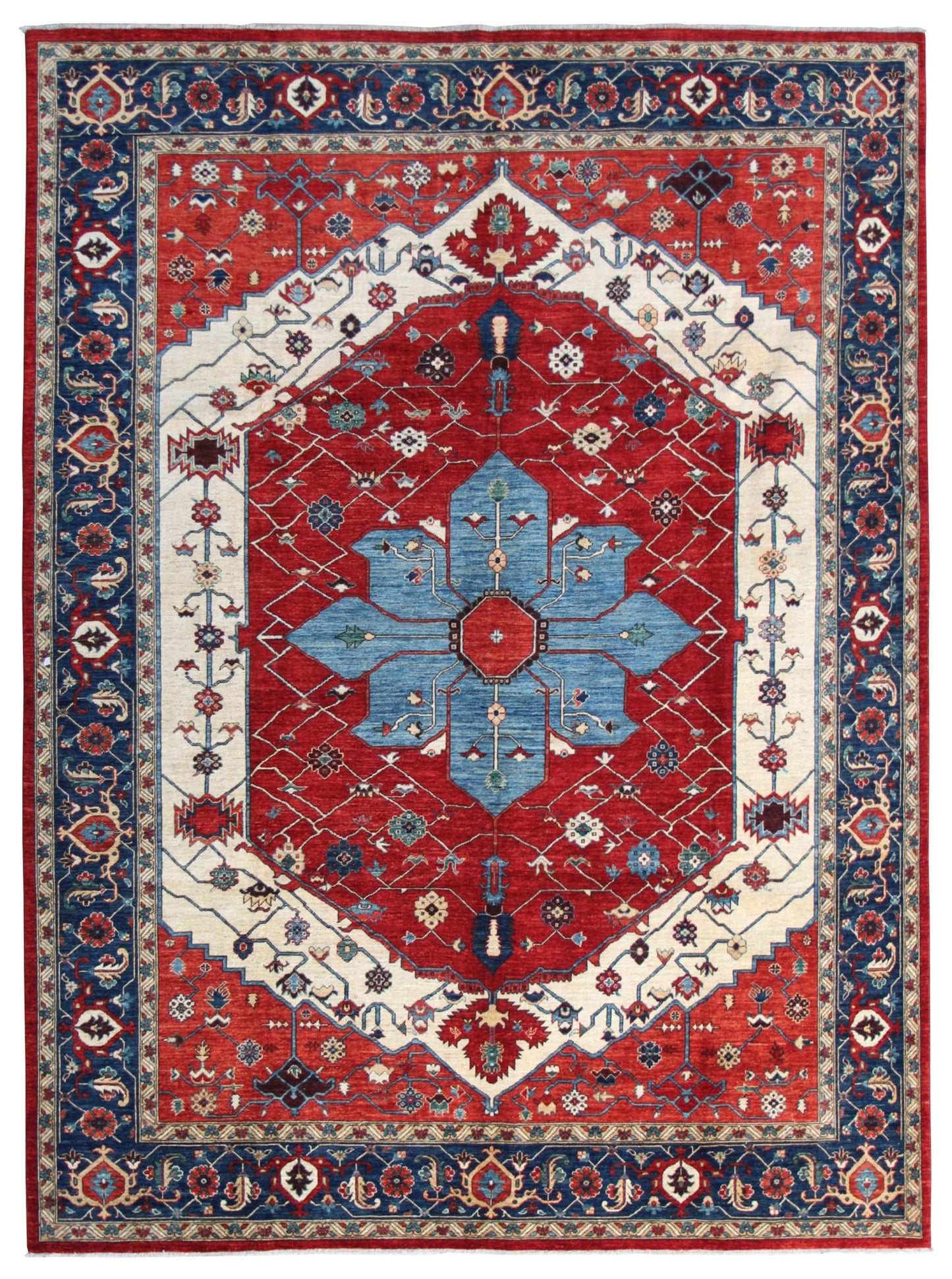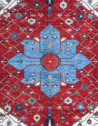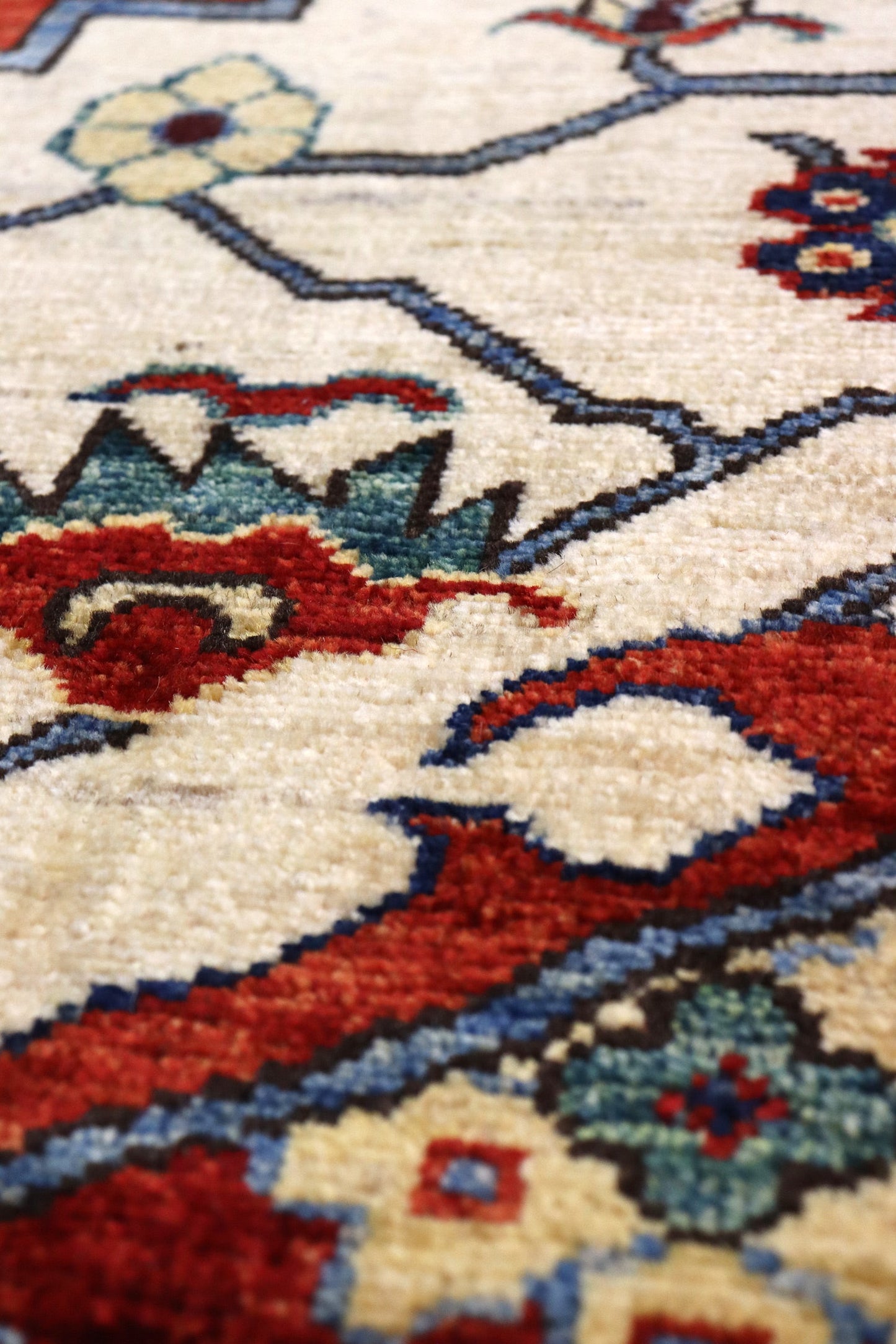 Introducing our exquisite Afghan rug with a captivating design inspired by the timeless traditions of the Serapi style. Originating from Afghanistan, this tribal rug exudes an authentic charm that will enhance any space with its vibrant colors.