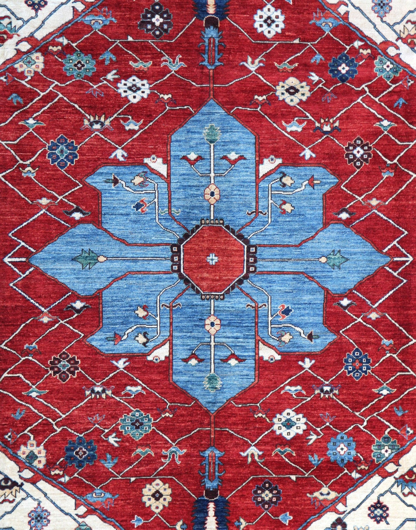 The raw Ghazni wool is then transported to the western side of Afghanistan, near Herat, where it undergoes the ancient process of hand carding and hand spinning, meticulously transforming it into carpet yarn. Each rug is lovingly woven on traditional floor looms within the weavers' own homes, reflecting the unique cottage industry production style that has been passed down through generations.