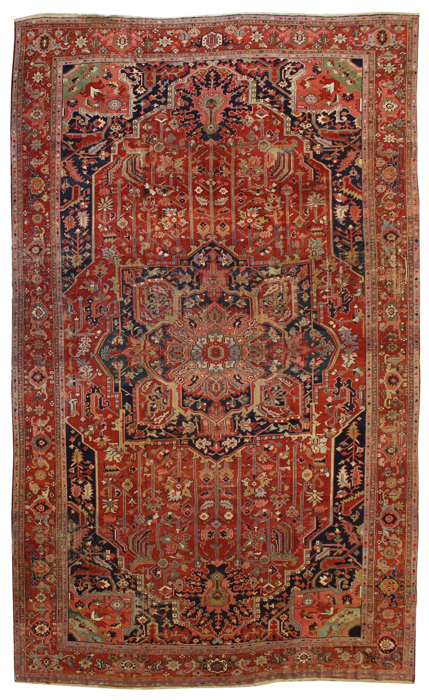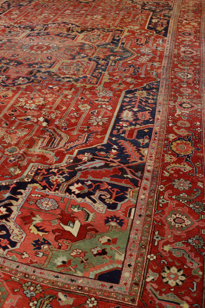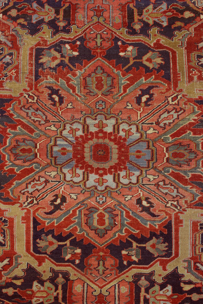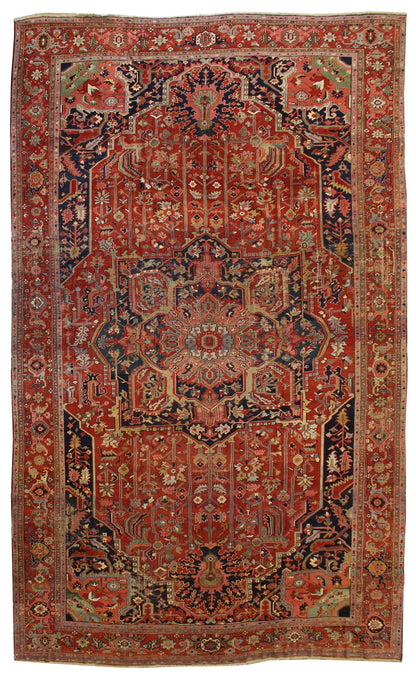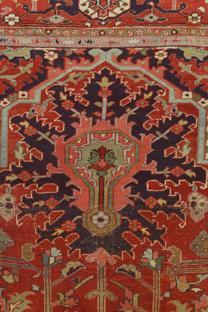 This antique Persian Serapi rug, dating back to circa 1900, showcases a classic tribal style with intricate design elements. Originating from the northwest mountainous regions of Persia, Serapi rugs are well-regarded for their distinct aesthetic and craftsmanship.