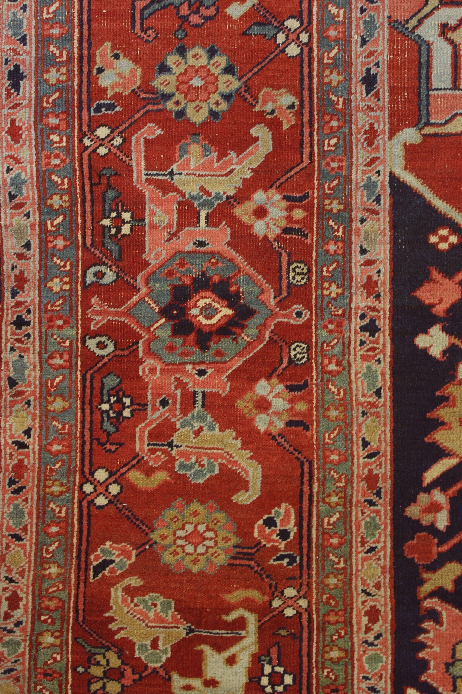 The borders of this rug consist of multiple layers with varying widths. The outermost border is the narrowest, featuring a repeating pattern of small geometric shapes and floral elements. The central border is the widest and displays larger, more elaborate floral designs that incorporate the same rich color palette as the main field. An innermost border, echoing the outer patterns but narrower, frames the central field adjacent to the medallion.