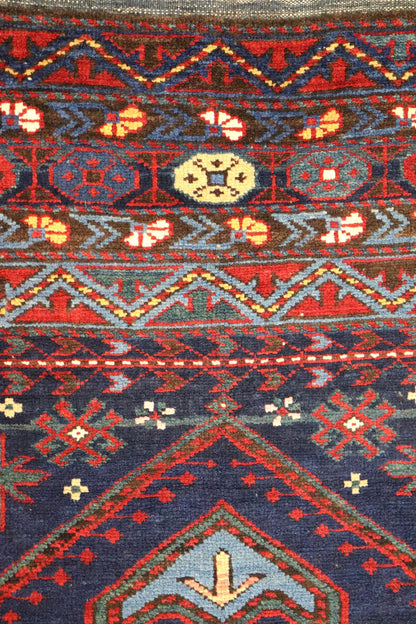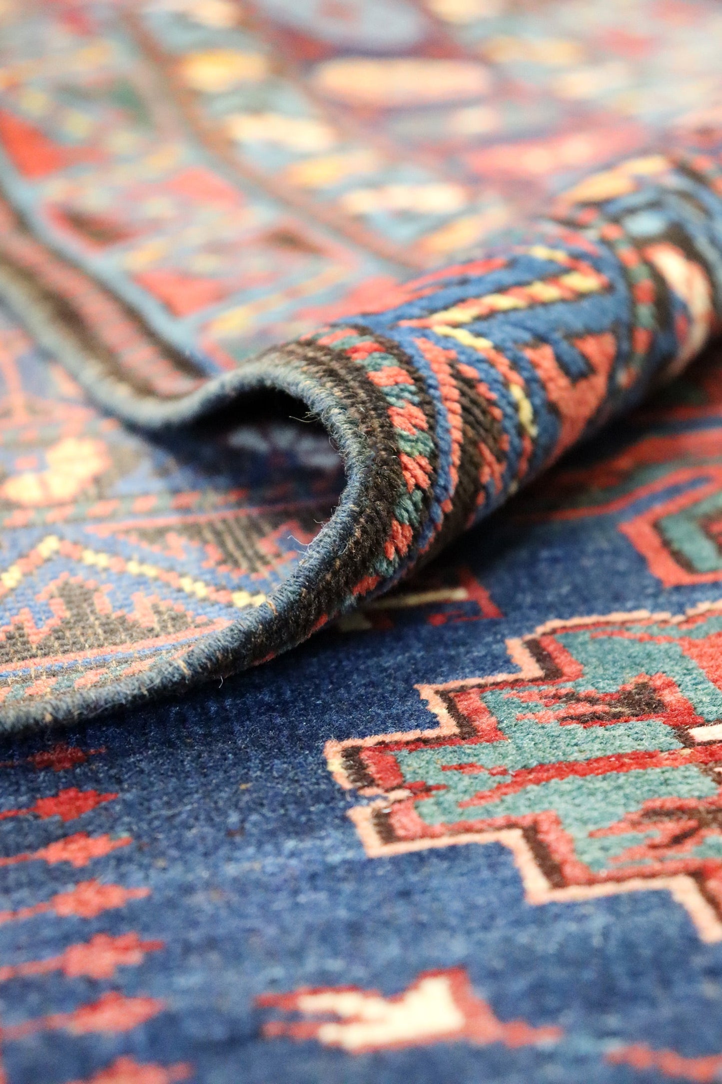 This particular Shirvan rug is crafted entirely of wool on wool, creating a sturdy yet supple textile. The primary background color is a deep navy blue, providing a rich canvas for the rug's intricate patterns. A rust-colored border frames the central design, creating a striking contrast with the navy backdrop. The dominant hue is blue, which integrates seamlessly with the other colors and brings cohesion to the overall design.