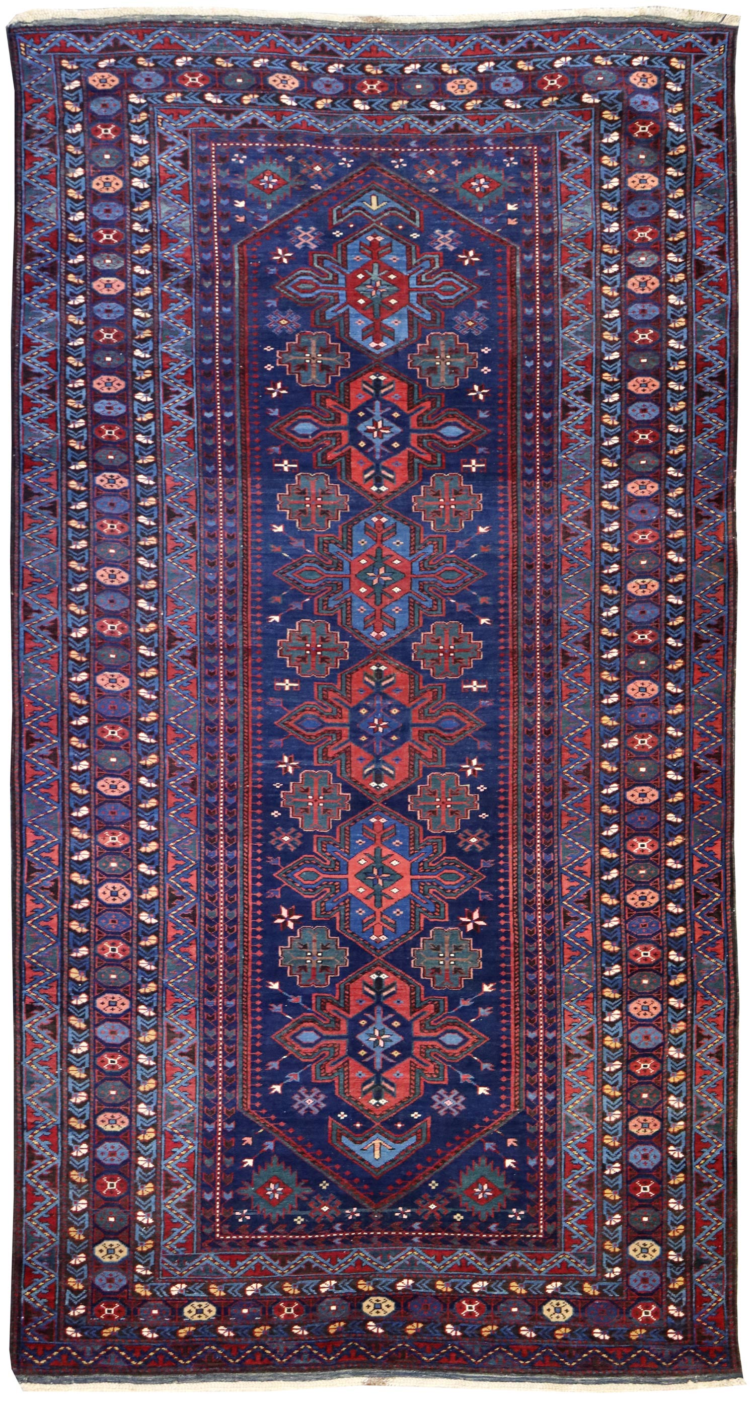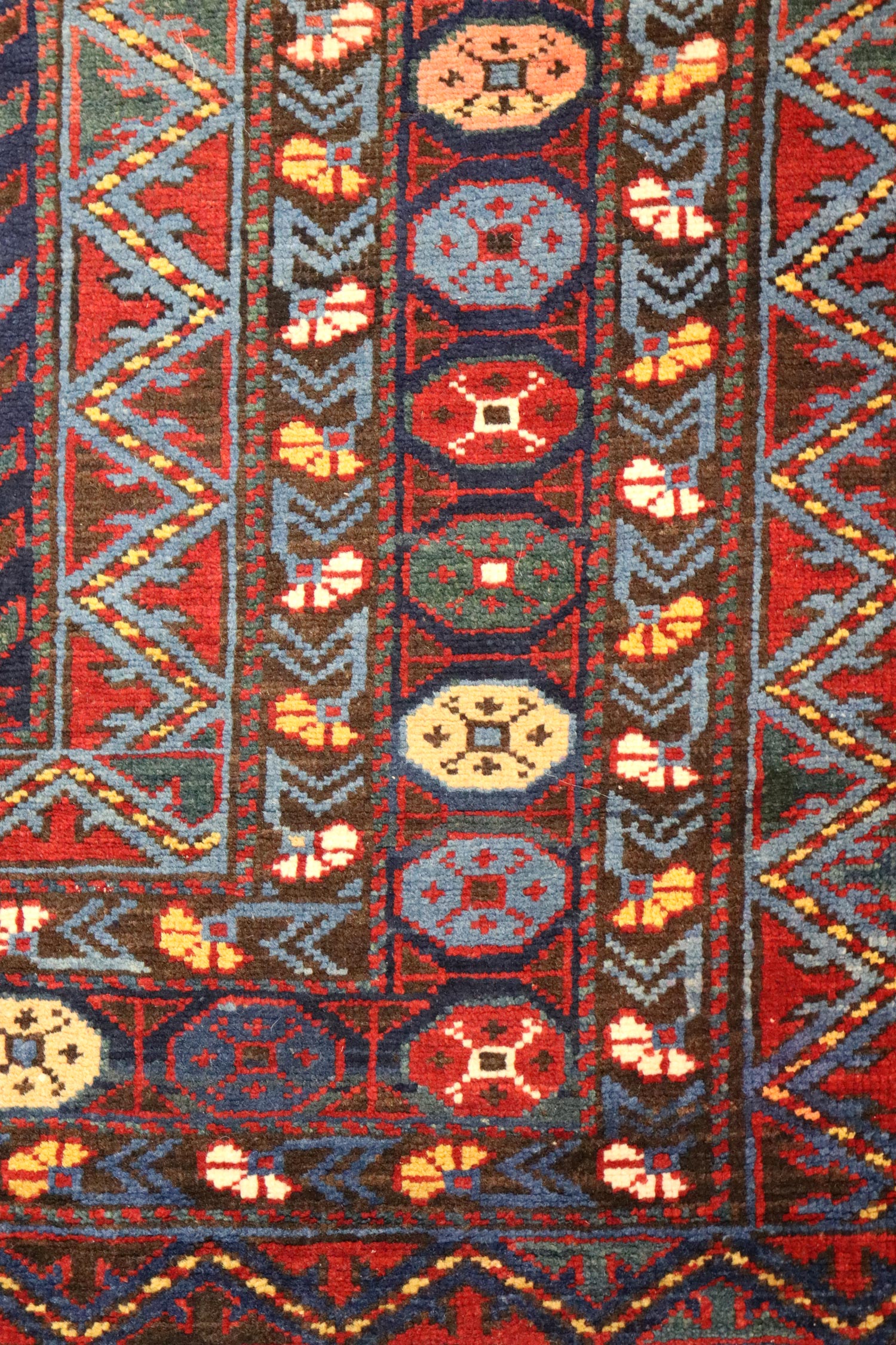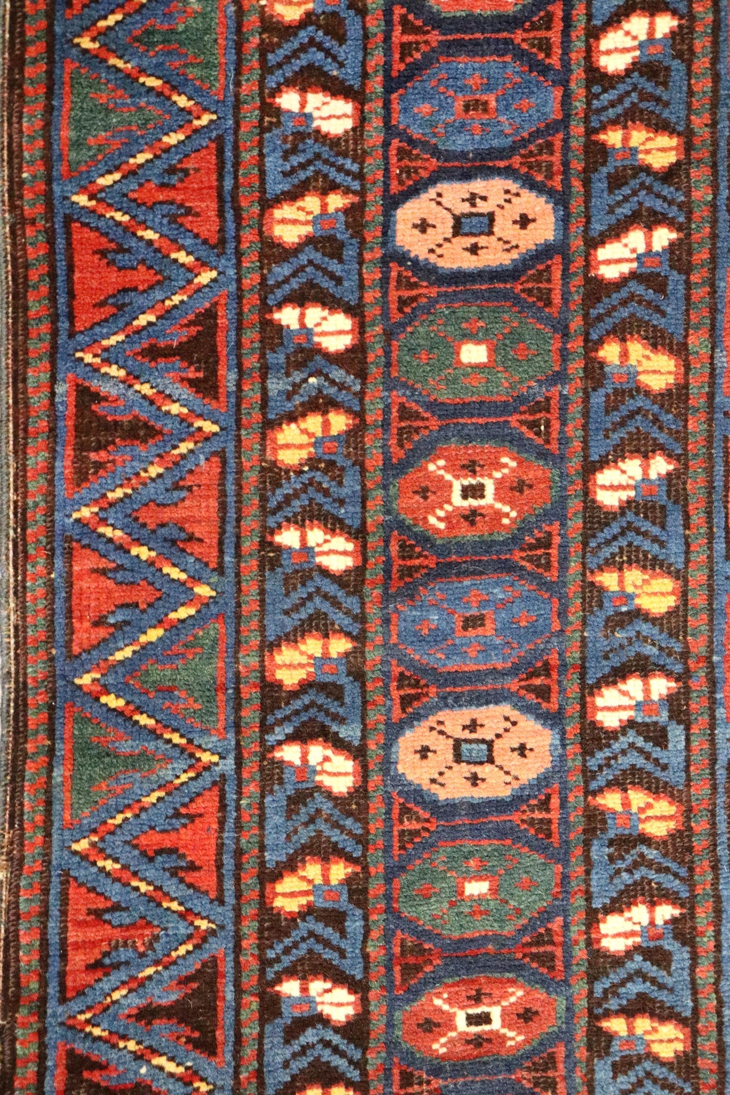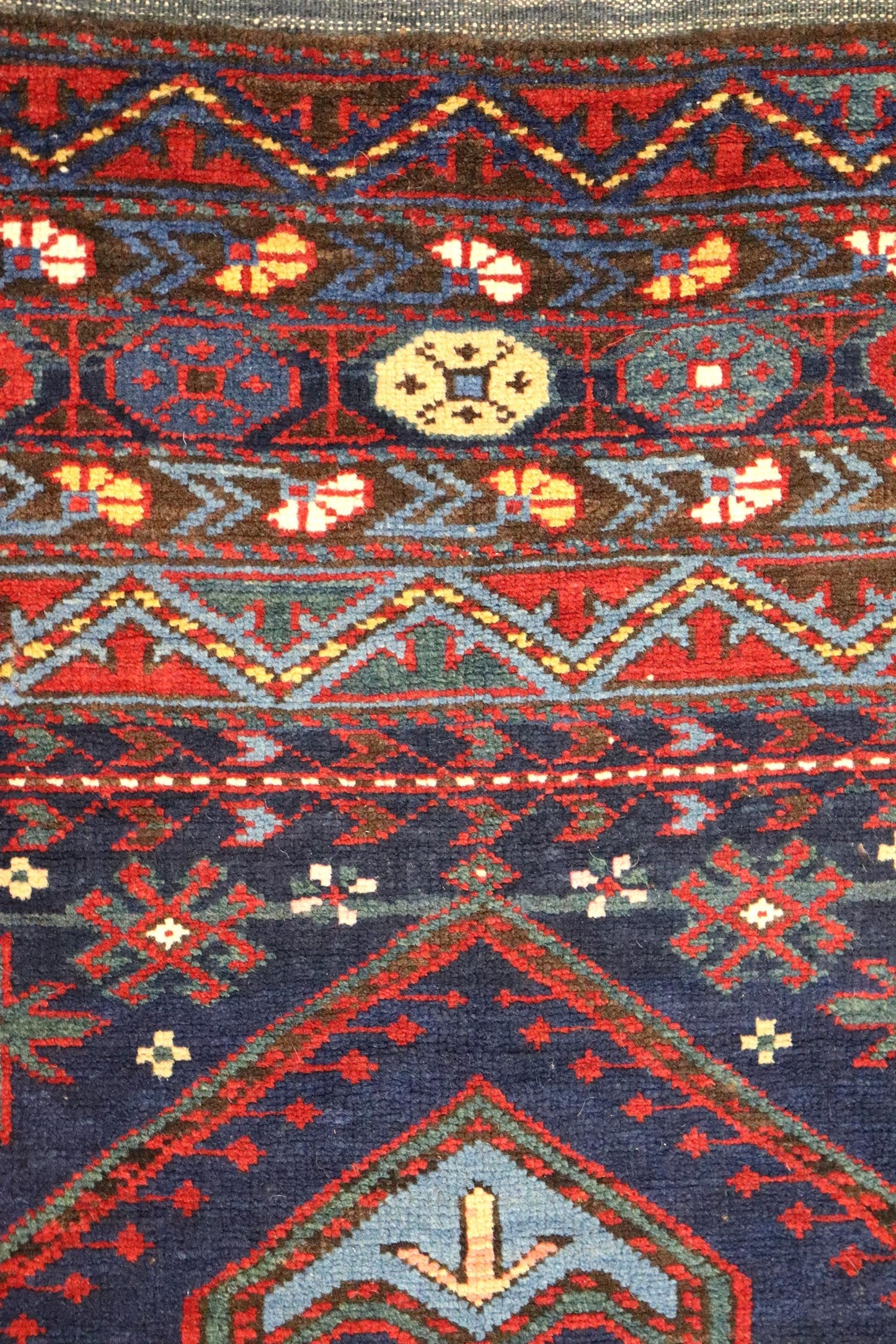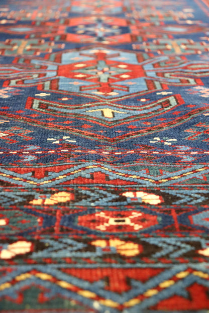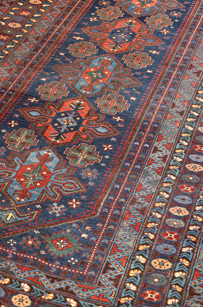 The overall design of the rug is highly symmetrical along its vertical axis, a common feature in traditional Shirvan pieces, which emphasizes the balanced and harmonious aesthetic. The thoughtful use of color, geometry, and symmetry in this rug makes it a fine example of the Shirvan weaving tradition, reflecting the cultural and artistic heritage of the region.