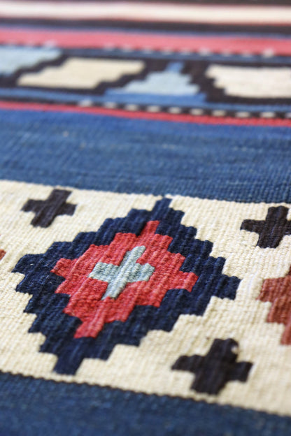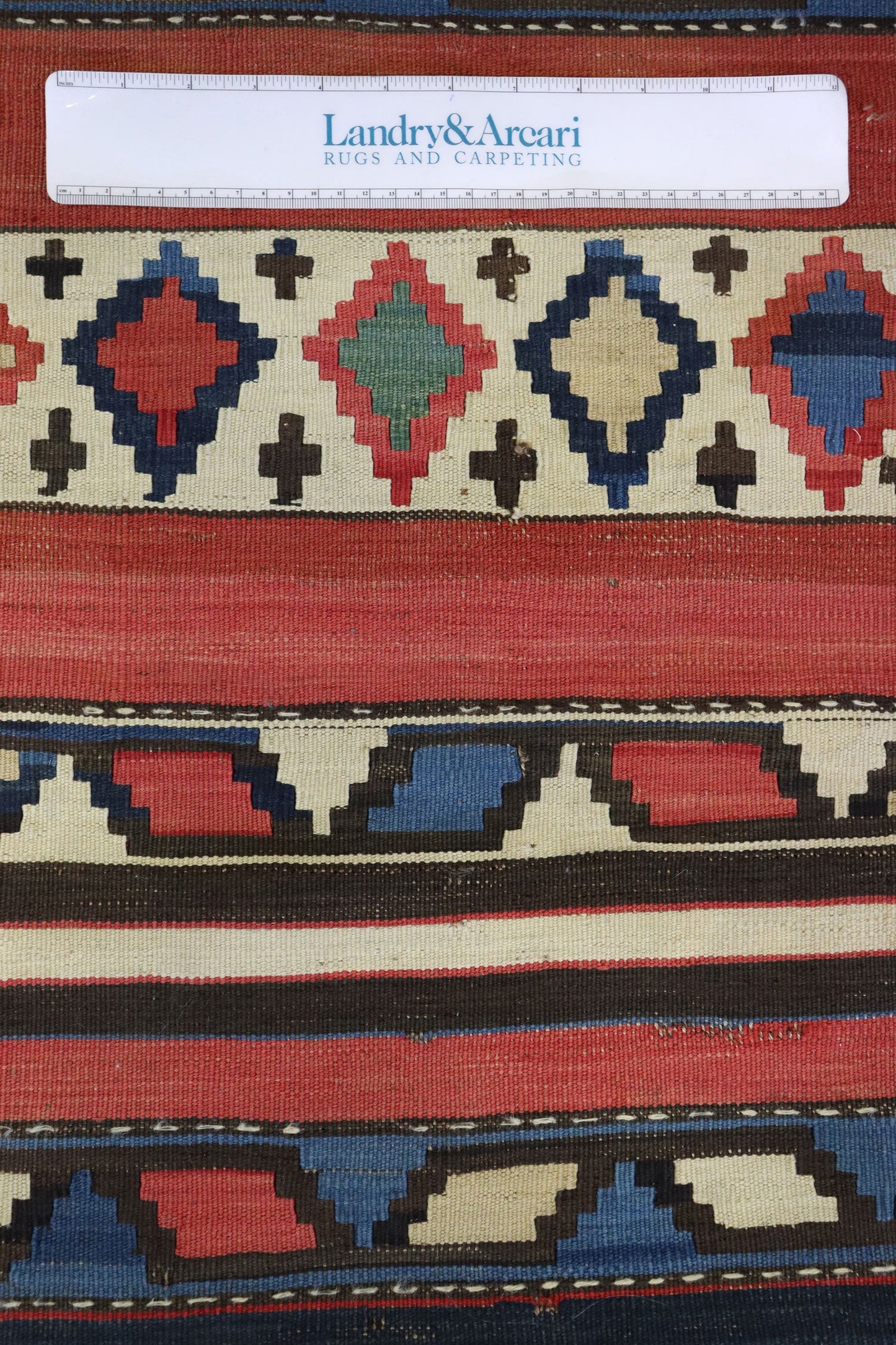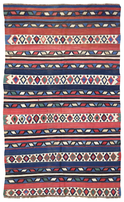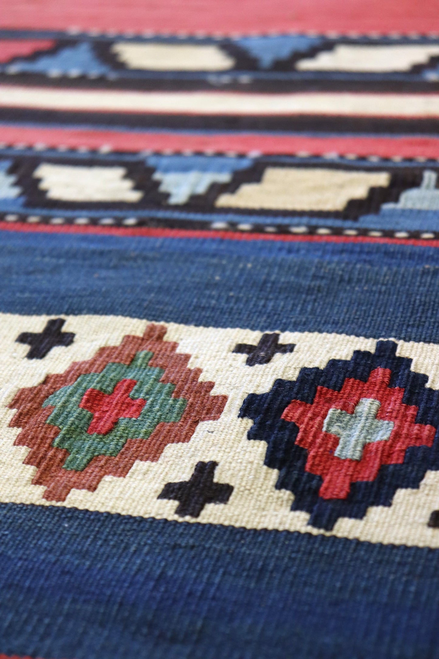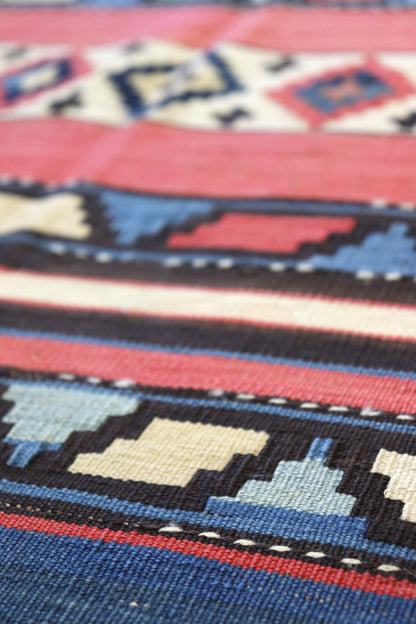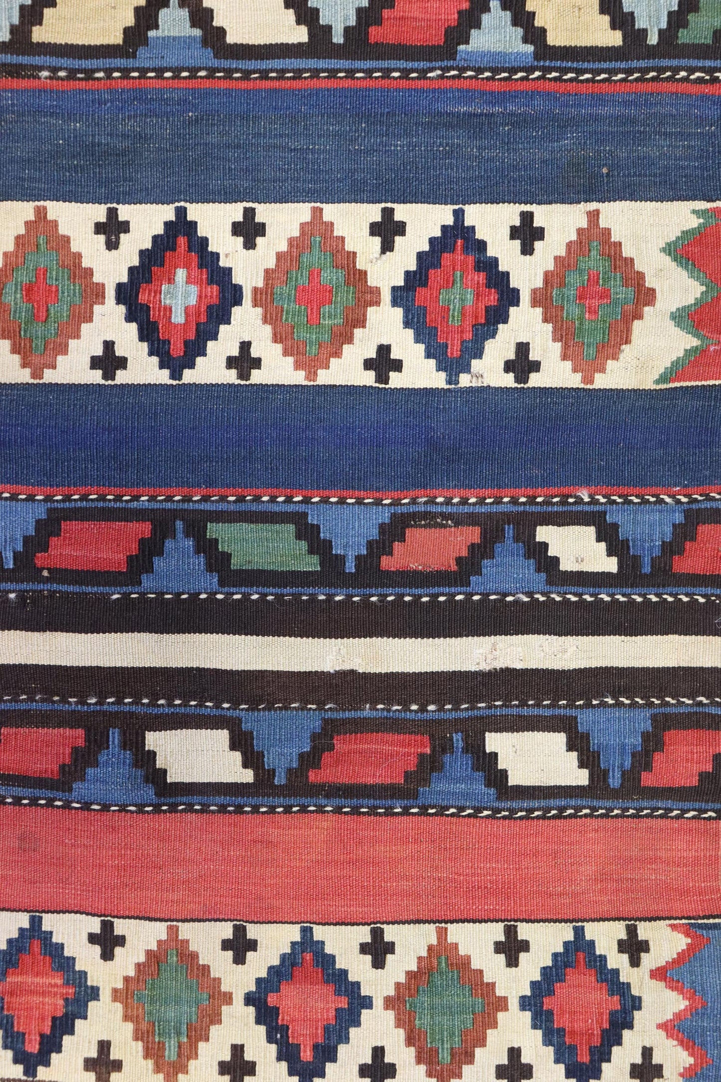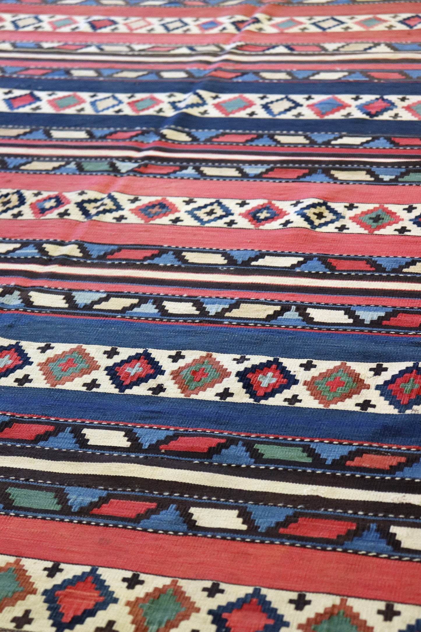 This rug does not feature a central medallion but instead focuses on consistent horizontal bands of patterns. Small details like dots or lines within the patterned bands enhance the rug's texture and complexity. The overall design maintains a traditional yet striking appearance, emphasizing geometric precision and color harmony typical of the region.