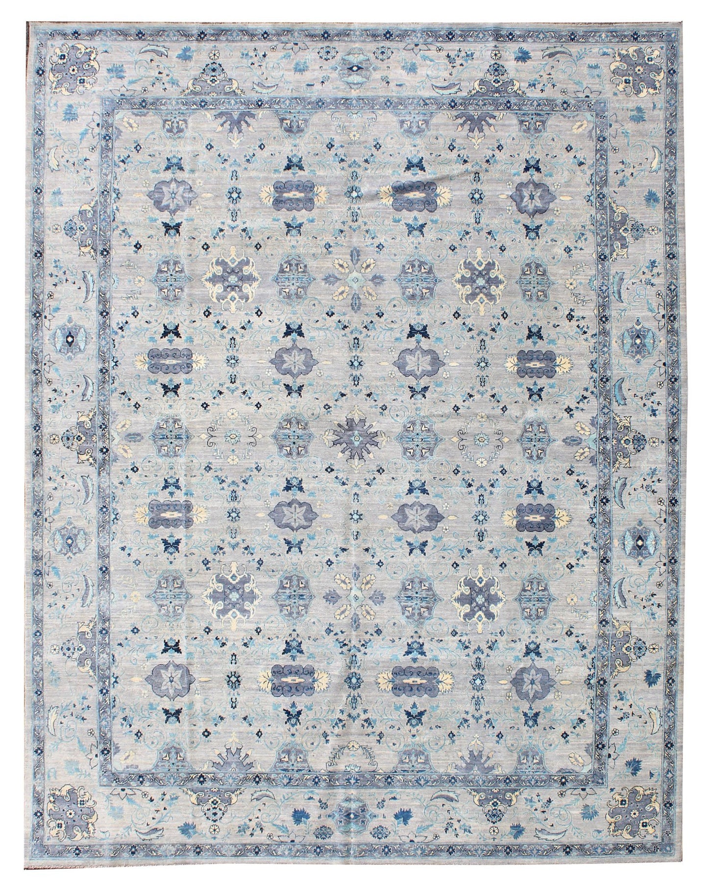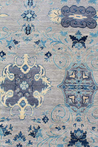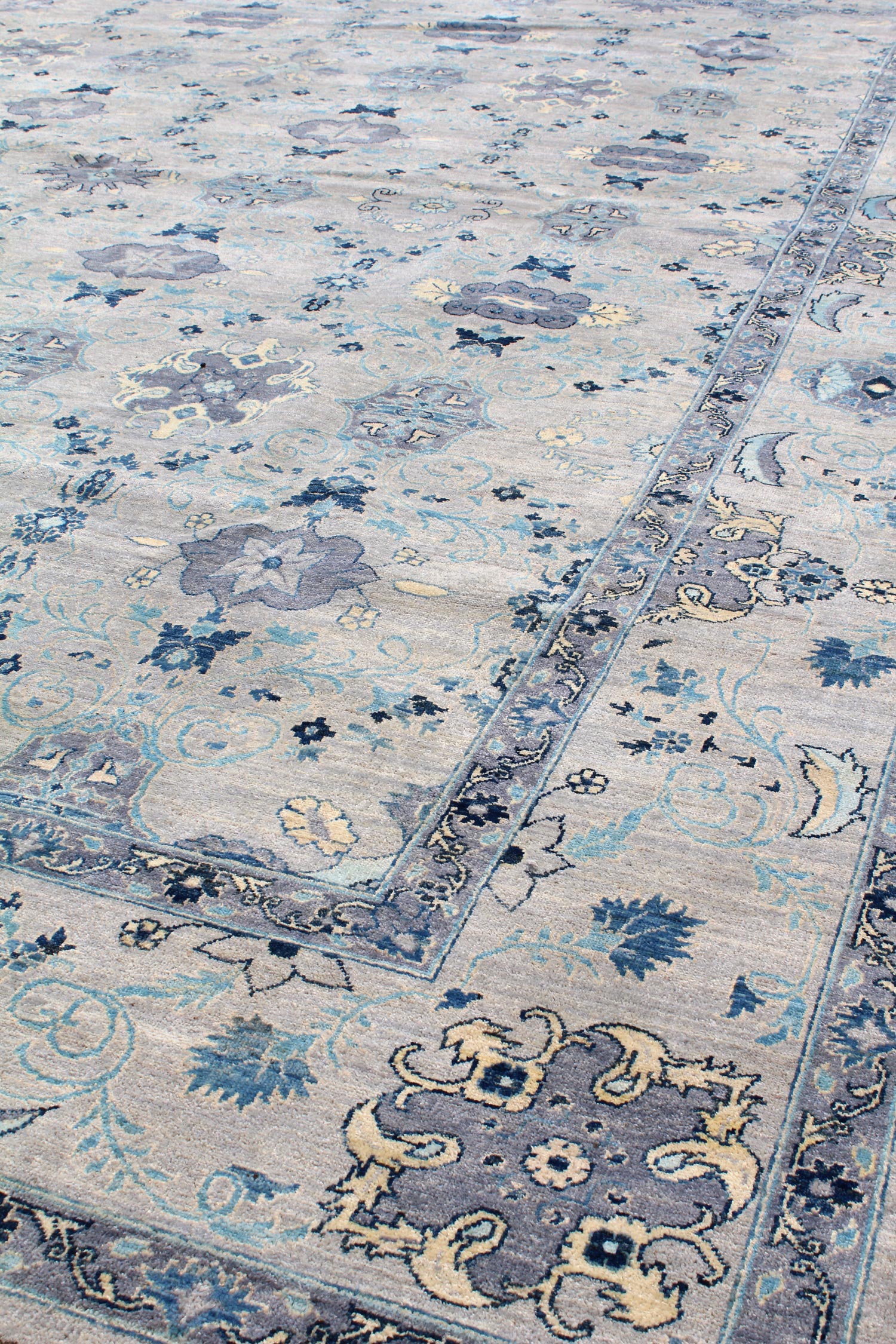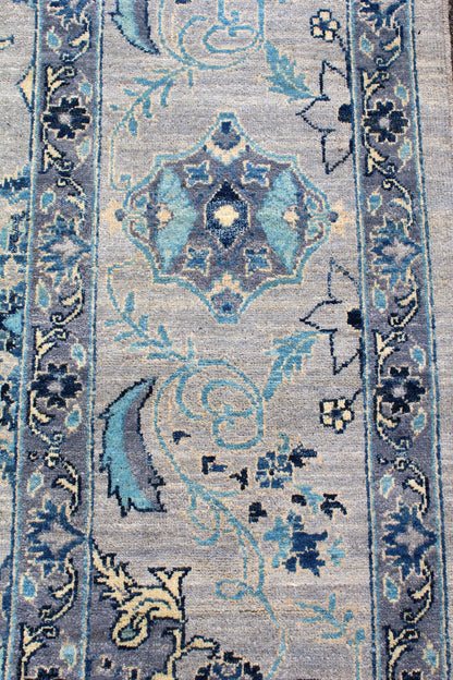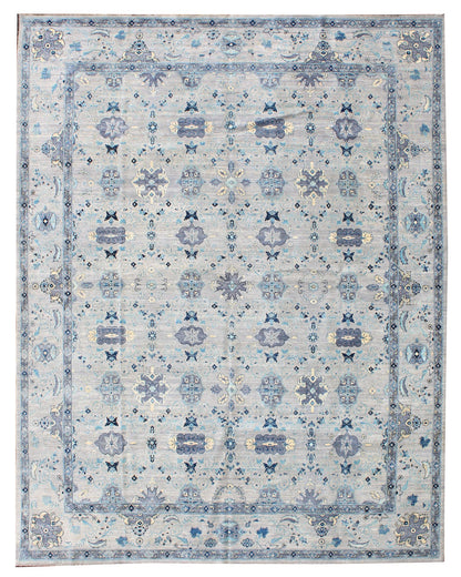 Skillfully woven on traditional floor looms in the weavers' own homes, this rug showcases an intricate design featuring the renowned Tabriz pattern. The background of the rug is elegantly silver, complemented by a light blue border that adds a touch of sophistication. The main colors of this masterpiece are a stunning shade of grey.