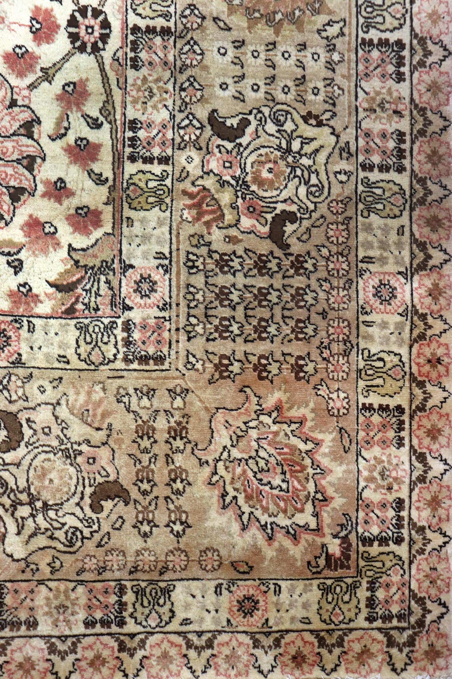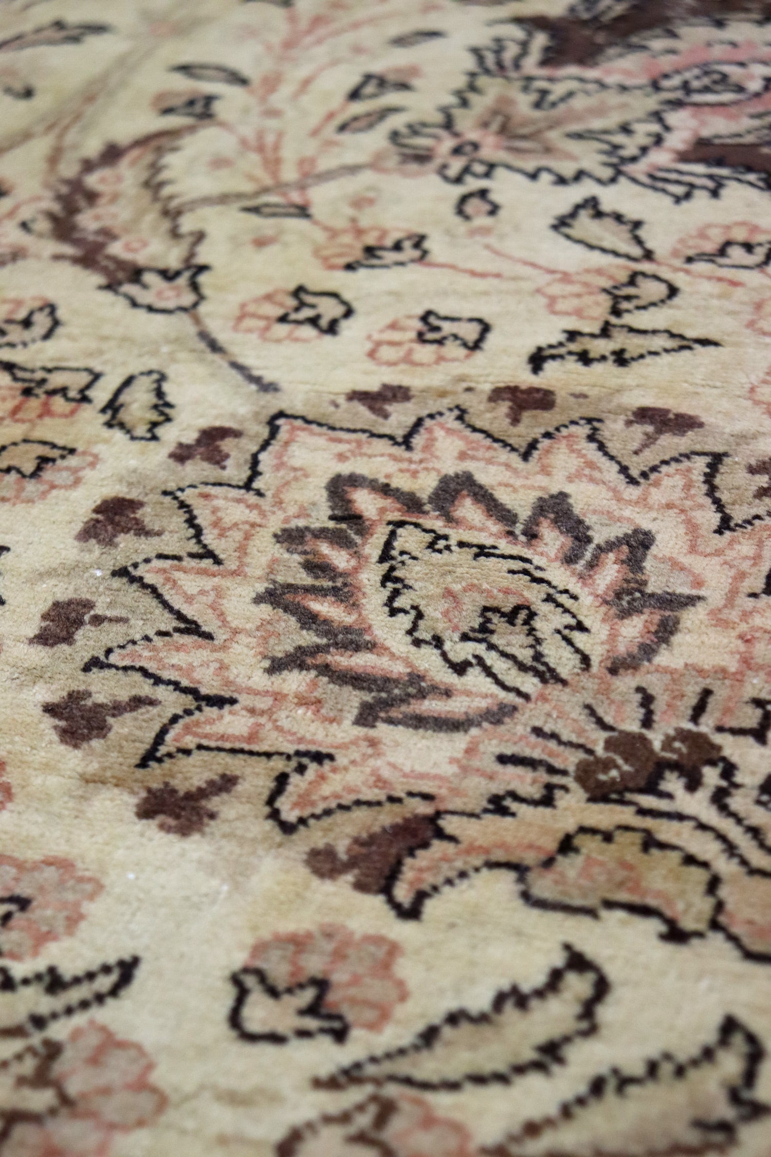 The design of this Tabriz rug epitomizes traditional Persian artistry, showcasing an array of floral and botanical motifs. These elements are meticulously interwoven to create a vivid tapestry of flowers, leaves, and vines, set against the neutral beige backdrop. The primary motifs are rendered in a harmonious palette that includes shades of brown, red, pink, and green. The subtle yet varied colors contribute to the rug’s sophisticated and intricate appearance.