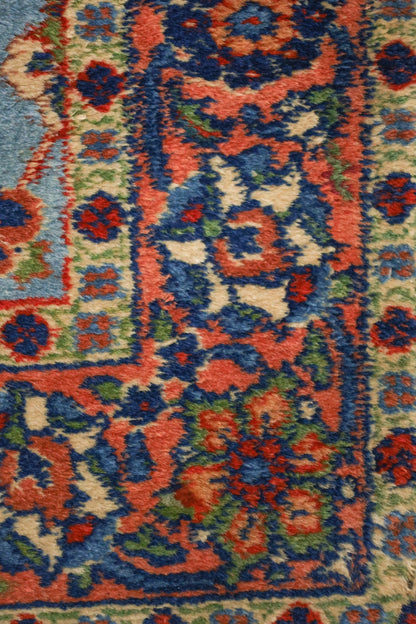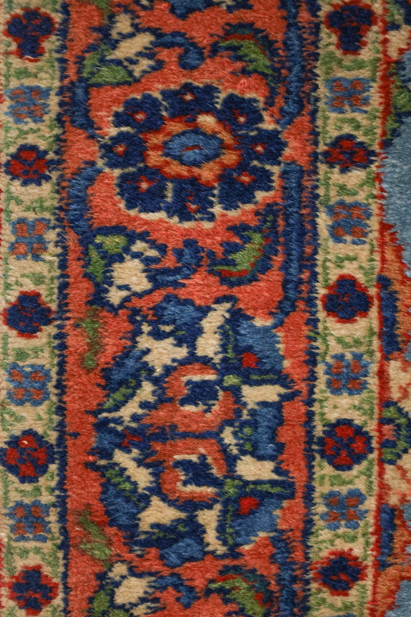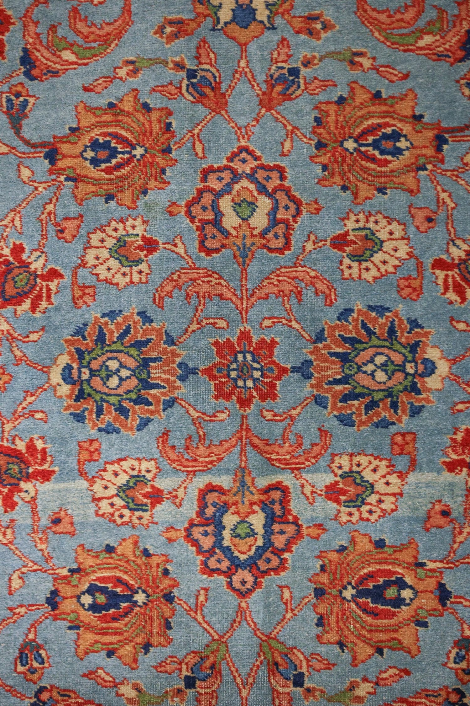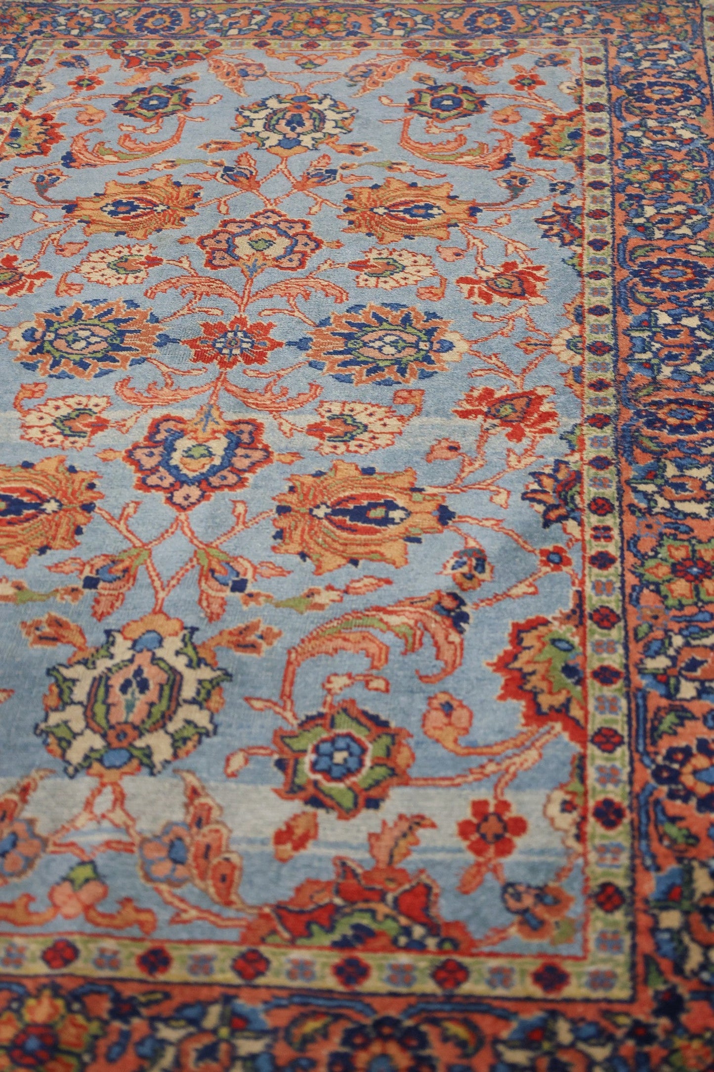 The primary background color of this antique piece is light blue, providing a serene canvas for the elaborate floral and foliate motifs that adorn it. These motifs are rendered in a spectrum of colors including red, orange, green, and dark blue, showcasing the weavers' meticulous attention to detail and artistry. The rug's main color palette centers around various shades of blue, creating a cohesive visual theme.