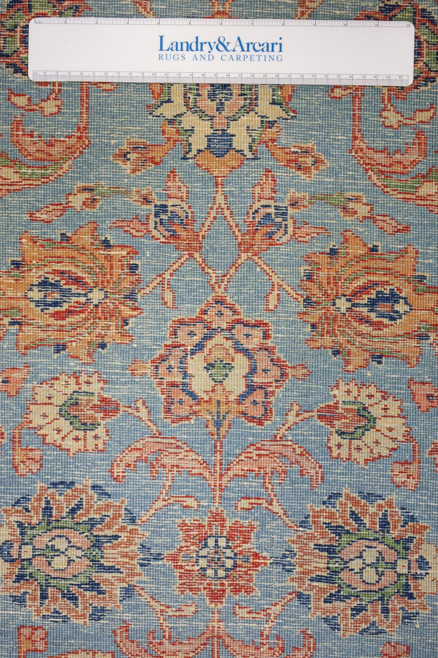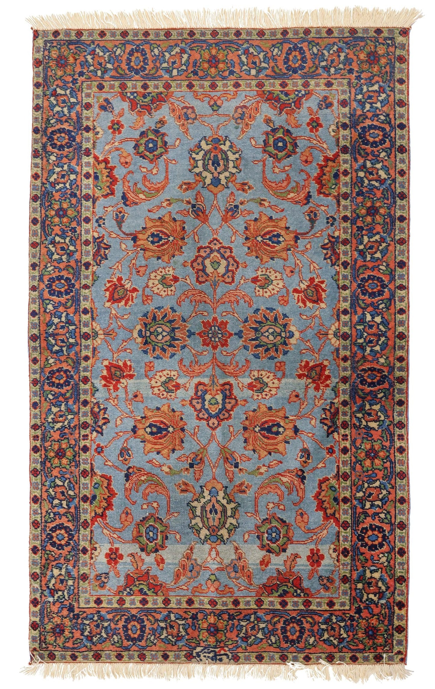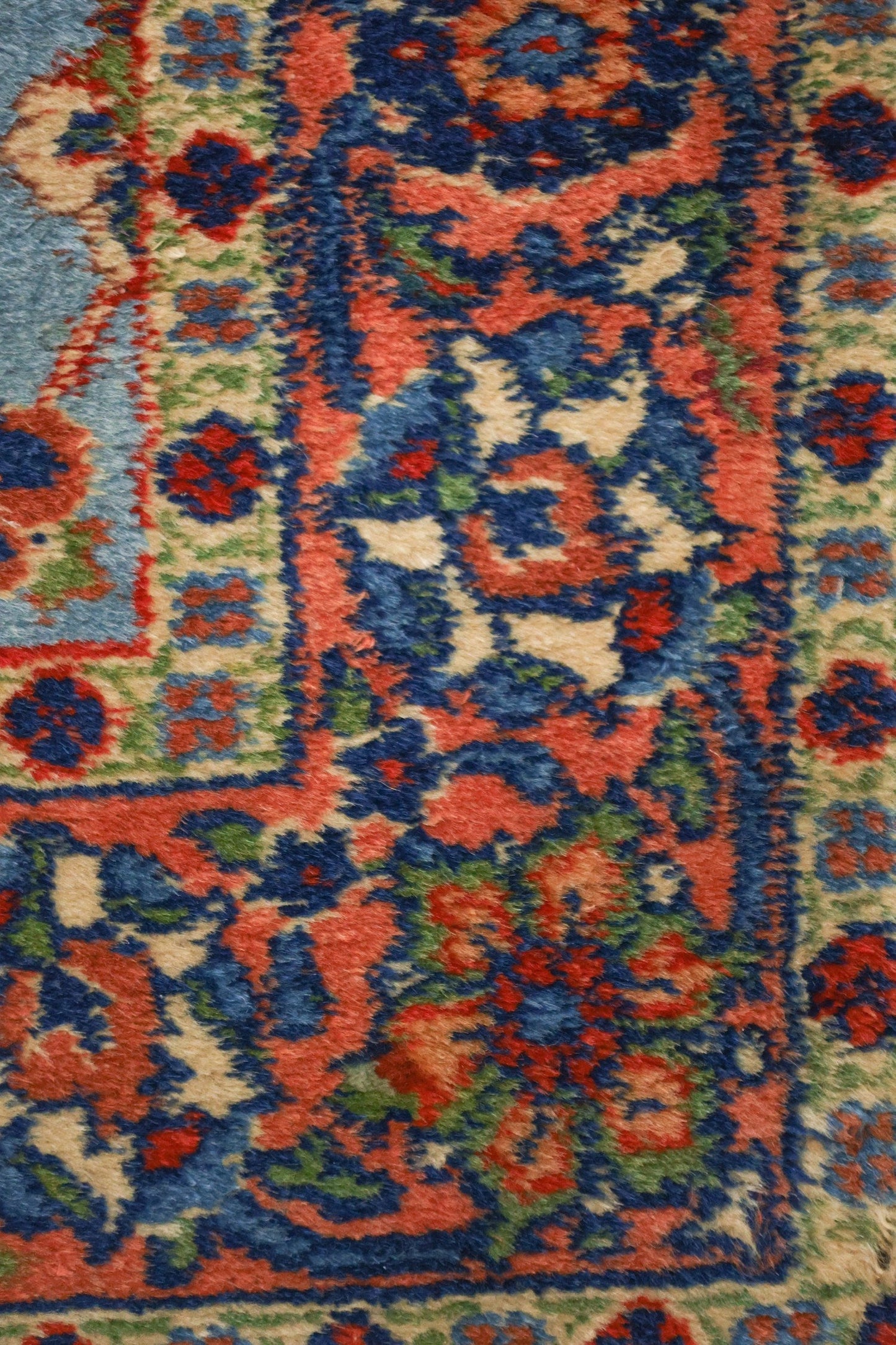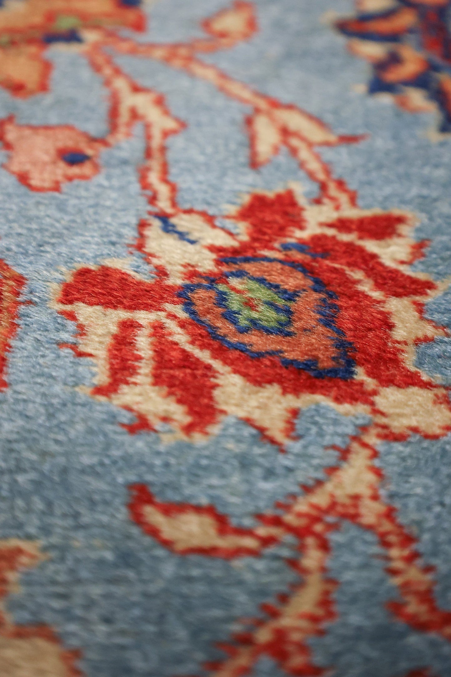 The primary background color of this antique piece is light blue, providing a serene canvas for the elaborate floral and foliate motifs that adorn it. These motifs are rendered in a spectrum of colors including red, orange, green, and dark blue, showcasing the weavers' meticulous attention to detail and artistry. The rug's main color palette centers around various shades of blue, creating a cohesive visual theme.